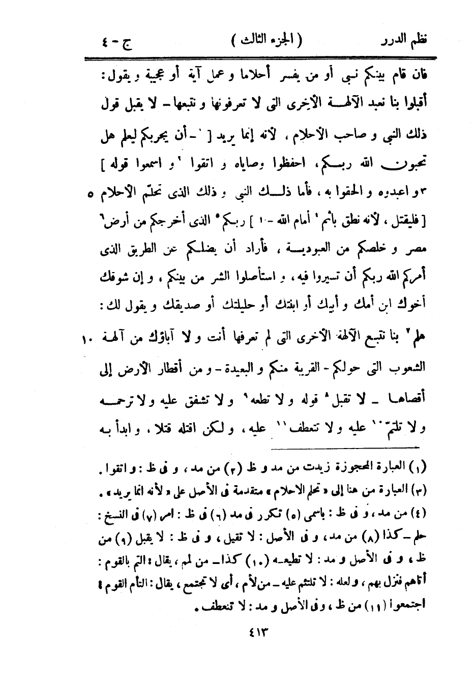 فإن قام بينكم نبي أو من يفسر أحلاماً وعمل آية أو عجيبة ويقول: اقبلوا بنا نعبد الآلهة الأخرى التي لا تعرفونها ونتبعها - لا يقبل قول ذلك النبي وصاحب الأحلام، لأنه إنما يريد، أن يجربكم ليعلم هل تحبون الله ربكم، احفظوا وصاياه واتقوا واسمعوا قوله واعبدوه والحقوا به، فأما ذلك النبي وذلك الذي تحلّم الأحلام فليقتل، لأنه نطق بإثم أمام الله ربكم الذي أخرجكم من أرض مصر وخلصكم من العبودية فأراد أن يضلكم عن الطريق الذي أمركم الله ربكم أن تسيروا فيه، واستأصلوا الشر من بينكم، وإن شوقك أخوك ابن أمك وأبيك أو ابنتك أو حليلتك أو صديقك ويقول لك: هلم بنا نتبع الآلهة الأخرى التي لم تعرفها أنت ولا آباؤك من آلهة الشعوب التي حولكم - القريبة منكم والبعيدة - ومن أقطار الأرض إلى أقصاها - لا تقبل قوله ولا تطعه ولا تشفق عليه ولا ترحمه ولا تلتمّ عليه ولا تتعطف عليه، ولكن اقتله قتلاً، وابدأ به