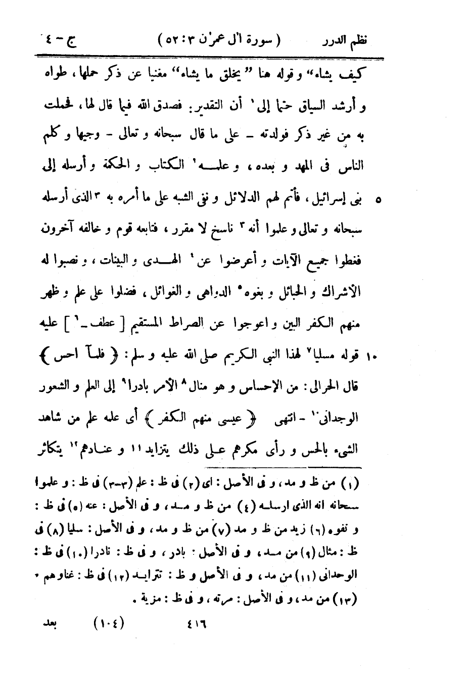 كيف يشاء} وقوله هنا {يخلق ما يشاء} مغنياً عن ذكر حملها، طواه وأرشد السياق حتماً إلى أن التقدير: فصدق الله فيما قال لها، فحملت به من غير ذكر فولدته - على ما قال سبحانه وتعالى - وجيهاً وكلم الناس في المهد وبعده، وعلمه الكتاب والحكمة وأرسله إلى بني إسرائيل، فأتم لهم الدلائل ونفى الشبه على ما أمره به الذي أرسله سبحانه وتعالى وعلموا أنه ناسخ لا مقرر، فتابعه قوم وخالفه آخرون فغطوا جميع الآيات وأعرضوا عن الهدى والبينات، ونصبوا له الأشراك والحبائل وبغوه الدواهي والغوائل، فضلوا على علم وظهر منهم الكفر البين واعوجوا عن الصراط المستقيم عطف عليه قوله مسلياً لهذا النبي الكريم صَلَّى اللهُ عَلَيْهِ وَسَلَّمَ: {فلما أحس} قال الحرالي: من الإحساس وهو منال الأمر بادراً إلى العلم والشعور الوجداني - انتهى {عيسى منهم الكفر} أي علمه علم من شاهد الشيء بالحس ورأى مكرهم على ذلك يتزايد وعنادهم يتكاثر