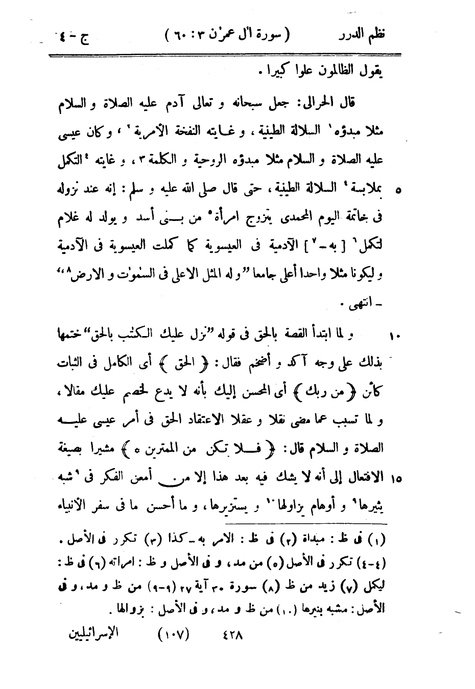 قال الحرالي: جعل سبحانه وتعالى آدم عليه الصلاة والسلام مثلاً مبدؤه السلالة الطينية، وغايته النفخة الأمرية، وكان عيسى عليه الصلاة ولاسلام مثلاً مبدؤه الروحية والكلمة، وغايته التكمل بملابسة السلالة الطينية، حتى قال صَلَّى اللهُ عَلَيْهِ وَسَلَّمَ: إنه عند نزوله في خاتمة اليوم المحمدي يتزوج امرأة من بني أسد ويولد له غلام لتكمل به الآدمية في العيسوية كما كملت العيسوية في الآدمية وليكون مثلاً واحداً أعلى جامعاً {وله المثل الأعلى في السماوات والأرض} [الروم: 27]- انتهى.