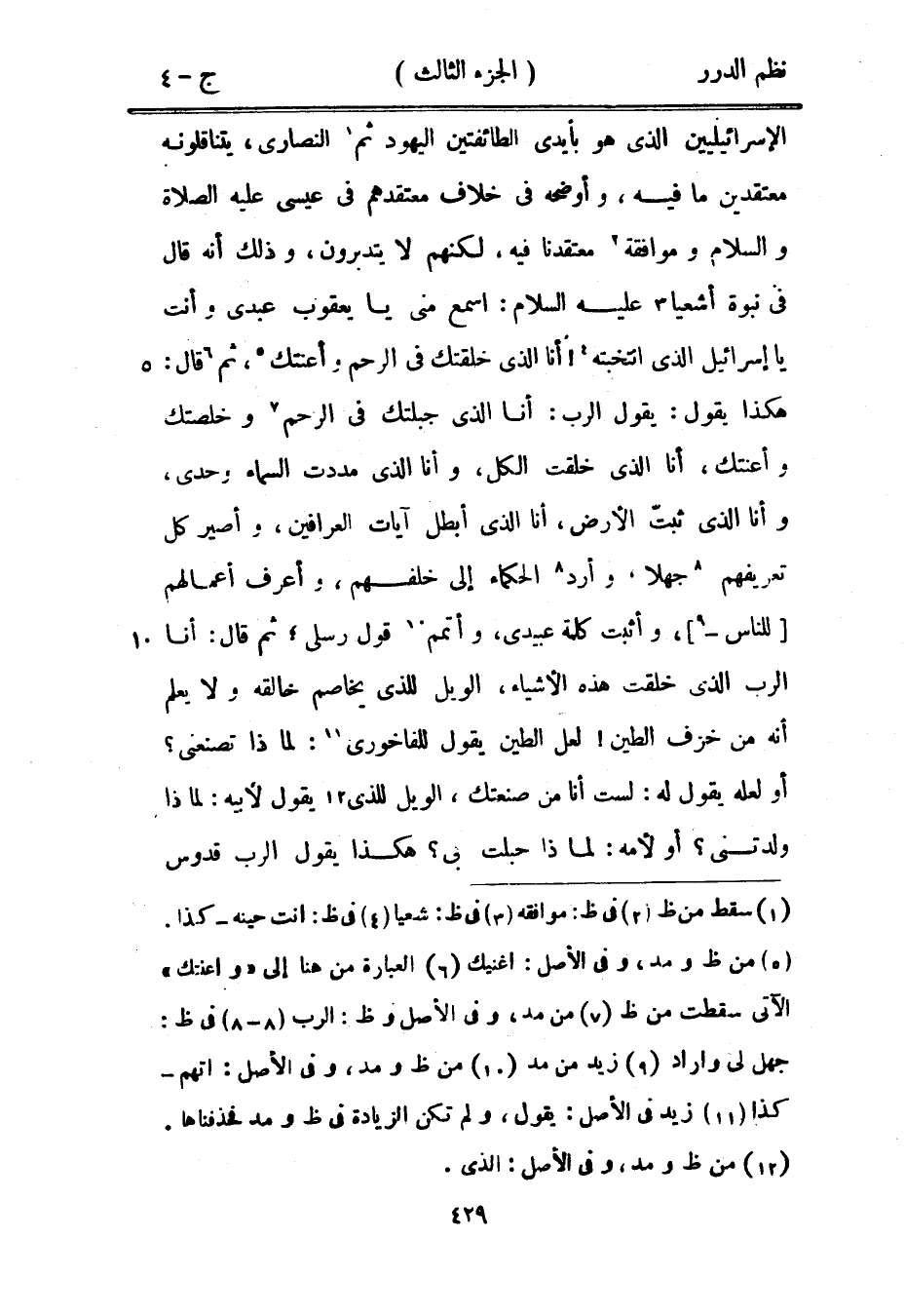 الإسرائيليين الذي هو بأيدي الطائفتين اليهود ثم النصارى، يتناقلونه معتقدين ما فيه، وأوضحه في خلاف معتقدهم في عيسى عليه الصلاة والسلام وموافقة معتقدنا فيه، لكنهم لا يتدبرون، وذلك أنه قال في نبوة أشعيا عليه السلام: اسمع مني يا يعقوب عبدي وأنت يا إسرائيل الذي انتخبته! أنا الذي خلقتك في الرحم وأعنتك، ثم قال: هكذا يقول: يقول الرب: أنا الذي جبلتك في الرحم وخلصتك وأعنتك، أنا الذي خلقت الكل، وأنا الذي مددت السماء وحدي، وأنا الذي ثبتّ الأرض، أنا الذي أبطل آيات العرافين، وأصير كل تعريفهم جهلاً، وأرد الحكماء إلى خلفهم، وأعرف أعمالهم للناس، وأثبت كلمة عبيدي، وأتمم قول رسلي؛ ثم قال: أنا الرب الذي خلقت هذه الأشياء، الويل للذي يخاصم خالقه ولا يعلم أنه من خزف الطين! لعل الطين يقول للفاخوري: لماذا تصنعني؟ أو لعله يقول له: لست أنا من صنعتك، الويل للذي يقول لأبيه: لماذا ولدتني؟ أو لأمه: لماذا حبلت بي؟ هكذا يقول الرب قدوس