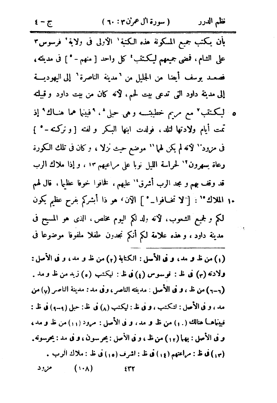 بأن يكتب جميع المسكونة هذه الكتبة الأولى في ولاية فرسوس على الشام، فمضى جميعهم ليكتتب كل واحد منهم في مدينته، فصعد يوسف أيضاً من الجليل من مدينة الناصرة إلى اليهودية إلى مدينة داود التي تدعى بيت لحم، لأنه كان من بيت داود وقبيلته ليكتتب مع مريم خطيبته وهي حبلى، فبينما هما هناك إذ تمت أيام ولادتها لتلد، فولدت ابنها البكر ولفته وتركته في مزود لأنه لم يكن لهما موضع حيث نزلا، وكان في تلك الكورة رعاة يسهرون لحراسة الليل نوباً على مراعيهم، وإذا ملاك الرب قد وقف بهم ومجد الرب أشرق عليهم، فخافوا خوفاً عظيماً، قال لهم الملاك: لا تخافوا الآن، هو ذا أبشركم بفرح عظيم يكون لكم ولجميع الشعوب، لأنه ولد لكم اليوم مخلص، الذي هو المسيح في مدينة داود، وهذه علامة لكم أنكم تجدون طفلاً ملفوفاً موضوعاً في مزود، وللوقت بغتة تراءى مع الملاك جنود كثيرة سماويون، يسبحون الله سبحانه وتعالى ويقولون: المجد لله في العلى، وعلى الأرض السلام، وفي الناس المسرة؛ فلما صعد الملائكة إلى السماء قال الرجال الرعاة بعضهم لبعض: امضوا بنا إلى بيت لحم لننظر الكلام الذي أعلمنا به الرب، فجاؤوا مسرعين فوجدوا مريم ويوسف والطفل موضوعاً في