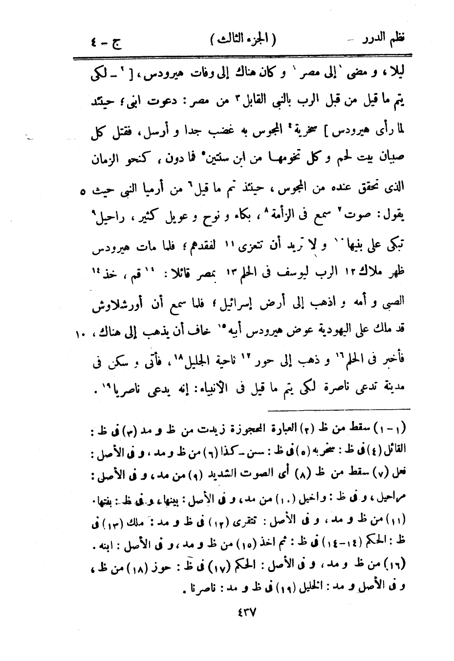 ليلاً، ومضى إلى مصر وكان هناك إلى وفاة هيرودس، لكي يتم ما قيل من قبل الرب بالنبي القابل من مصر: دعوت ابني؛ حينئذ لما رأى هيرودس سخرية المجوس به غضب جداً وأرسل، فقتل كل صبيان بيت لحم وكل تخومها من ابن سنتين فما دون، كنحو الزمان الذي تحقق عنده من المجوس، حينئذ تم ما قيل من أرميا النبي حيث يقول: صوت سمع في الزأمة، بكاء ونوح وعويل كثير، راحيل تبكي على بنيها ولا تريد أن تتعزى لفقدهم؛ فلما مات هيرودس ظهر ملاك الرب ليوسف في الحلم بمصر قائلاً: قم، خذ الصبي وأمه واذهب إلى أرض إسرائيل؛ فما سمع أن أورشلاوش قد ملك على اليهودية عوض هيرودس أبيه خاف أن يذهب إلى هناك، فأخبر في الحلم وذهب إلى حور ناحية الجليل، فأتى وسكن في مدينة تدعى ناصرة لكي يتم ما قيل في الأنبياء: إنه يدعى ناصريا