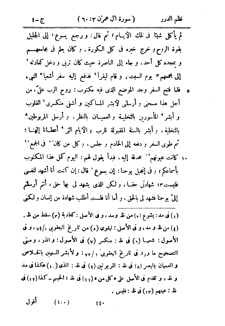 لم يأكل شيئاً في تلك الأيام؛ ثم قال: ورجع يسوع إلى الجليل بقوة الروح وخرج خبره في كل الكورة، وكان يعلم في مجامعهم ويمجده كل أحد، وجاء إلى الناصرة حيث كان تربى ودخل كعادته إلى مجمعهم يوم السبت، وقام ليقرأ فدفع إليه سفر أشعيا النبي فلما فتح السفر وجد الموضع الذي فيه مكتوب: روح الرب عليّ، من أجل هذا مسحني وأرسلني لأبشر المساكين وأشفي منكسري القلوب وأبشر المأسورين بالتخلية والعميان بالنظر، وأرسل المربوطين بالتخلية، وأبشر بالسنة المقبولة للرب والأيام التي أعطانا إلهنا؛ ثم طوى السفر ودفعه إلى الخادم وجلس، وكل من كان في الجمع كانت عيونهم محدقة إليه، فبدأ يقول لهم: اليوم كمل هذا المكتوب بأسماعكم؛ وفي إنجيل يوحنا: إن يسوع قال: إن كنت أنا أشهد لنفسي فليست شهادتي حقاً، ولكن الذي يشهد لي بها حق، أنتم أرسلتم إليّ يوحنا فشهد لي بالحق، وأما أنا فلست أطلب شهادة من إنسان ولكني