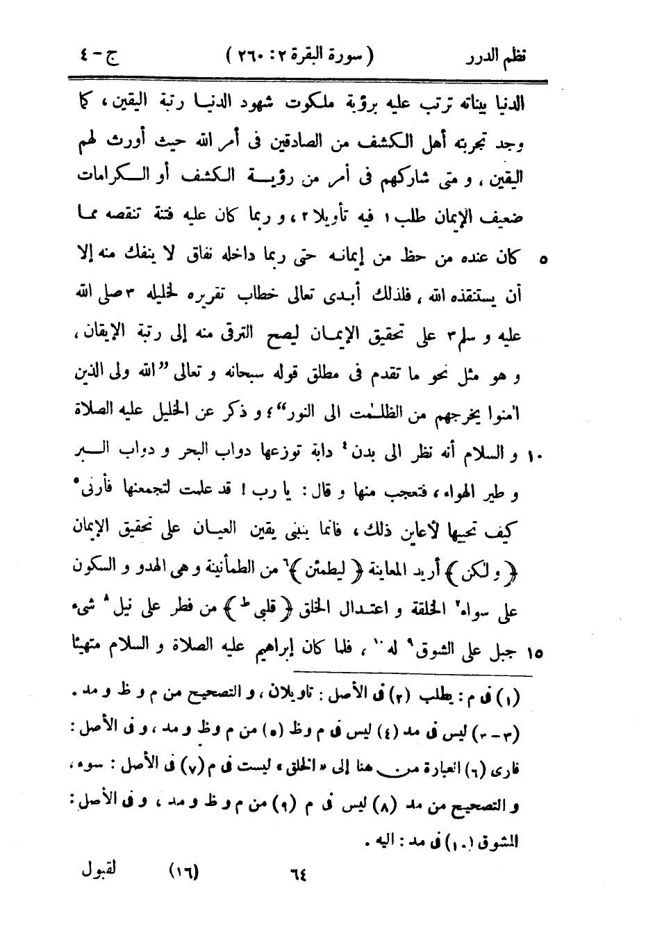 الدنيا بيناته ترتب عليه برؤية ملكوت شهود الدنيا رتبة اليقين، كما وجد تجربته أهل الكشف من الصادقين في أمر الله حيث أورث لهم اليقين، ومتى شاركهم في أمر من رؤية الكشف أو الكرامات ضعيف الإيمان طلب فيه تأويلاً، وربما كان عليه فتنة تنقصه مما كان عنده من حظ من إيمانه حتى ربما داخله نفاق لا ينفك منه إلا أن يستنقذه الله، فلذلك أبدى تعالى خطاب تقريره لخليله صَلَّى اللهُ عَلَيْهِ وَسَلَّمَ على تحقيق الإيمان ليصح الترقي منه إلى رتبة الإيقان، وهو مثل نحو ما تقدم في مطلق قوله سبحانه وتعالى {الله ولي الذين آمنوا يخرجهم من الظلمات إلى النور} [البقرة: 257] وذكر عن الخليل عليه الصلاة والسلام أنه نظر إلى بدن دابة توزعها دواب البحر ودواب البر وطير الهواء، فتعجب منها وقال: يا رب! قد علمت لتجمعنها فأرني كيف تحييها لأعاين ذلك، فإنما ينبني يقين العيان على تحقيق الإيمان {ولكن} أريد المعاينة {ليطمئن} من الطمأنينة وهي الهدو والسكون على سواء الخلقة واعتدال الخلق {قلبي} من فطر على نيل شيء جبل على الشوق له، فلما كان إبراهيم عليه الصلاة والسلام متهيئاً