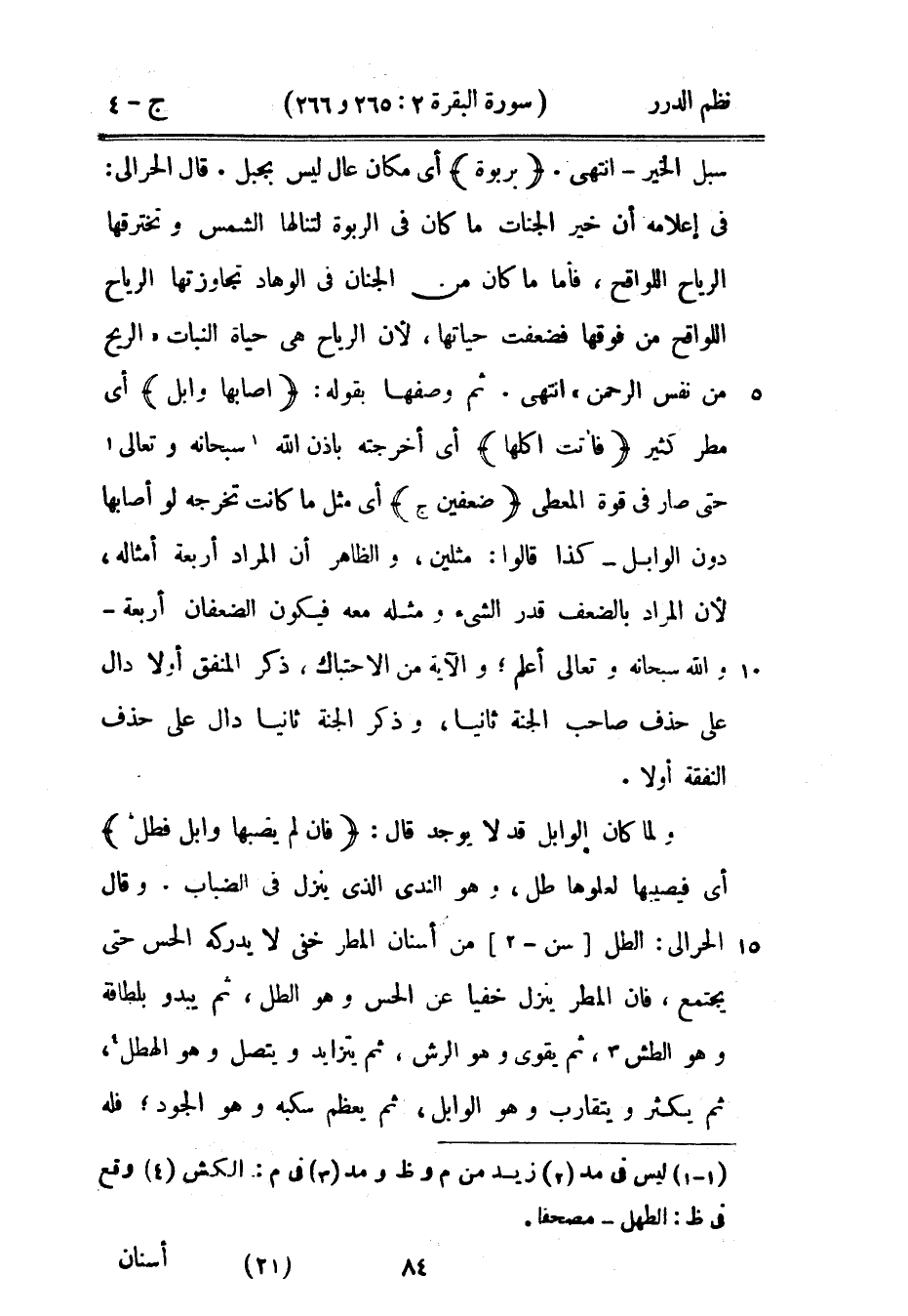 ولما كان الوابل قد لا يوجد قال: {فإن لم يصبها وابل فطل} أي فيصيبها لعلوها طل، وهو الندى الذي ينزل في الضباب. وقال الحرالي: الطل سن من أسنان المطر خفي لا يدركه الحس حتى يجتمع، فإن المطر ينزل خفياً عن الحس وهو الطل، ثم يبدو بلطافة وهو الطش، ثم يقوى وهو الرش، ثم يتزايد ويتصل وهو الهطل، ثم يكثر ويتقارب وهو الوابل، ثم يعظم سكبه وهو الجود؛ فله