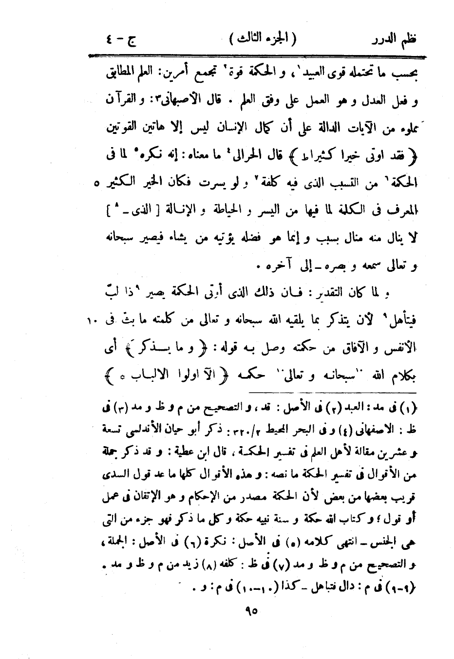 بحسب ما تحتمله قوى العبيد، والحكمة قوة تجمع أمرين: العلم المطابق وفعل العدل وهو العمل على وفق العلم. قال الأصبهاني: والقرآن مملوء من الآيات الدالة على أن كمال الإنسان ليس إلا هاتين القوتين {فقد أوتي خيراً كثيراً} قال الحرالي ما معناه: إنه نكرة لما في الحكمة من التسبب الذي فيه كلفة ولو يسرت فكان الخير الكثير المعرف في الكلمة لما فيها من اليسر والحياطة والإنالة الذي لا ينال منه منال بسبب وإنما هو فضله يؤتيه من يشاء فيصير سبحانه وتعالى سمعه وبصره - إلى آخره.