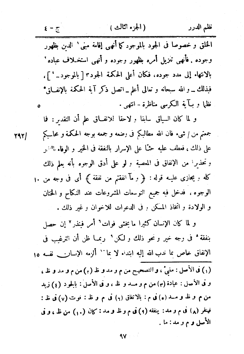 الخلق وخصوصاً في الجود بالموجود كما أنهى إقامة مبنى الدين بظهور وجوده، فأنهى تنزيل أمره بظهور وجوده وأنهى استخلاف عباده بالانتهاء إلى مدد جوده، فكان أعلى الحكمة الجود بالموجود فبذلك - والله سبحانه وتعالى أعلم - اتصل ذكر آية الحكمة بالإنفاق نظماً وبآية الكرسي مناظرة - انتهى.