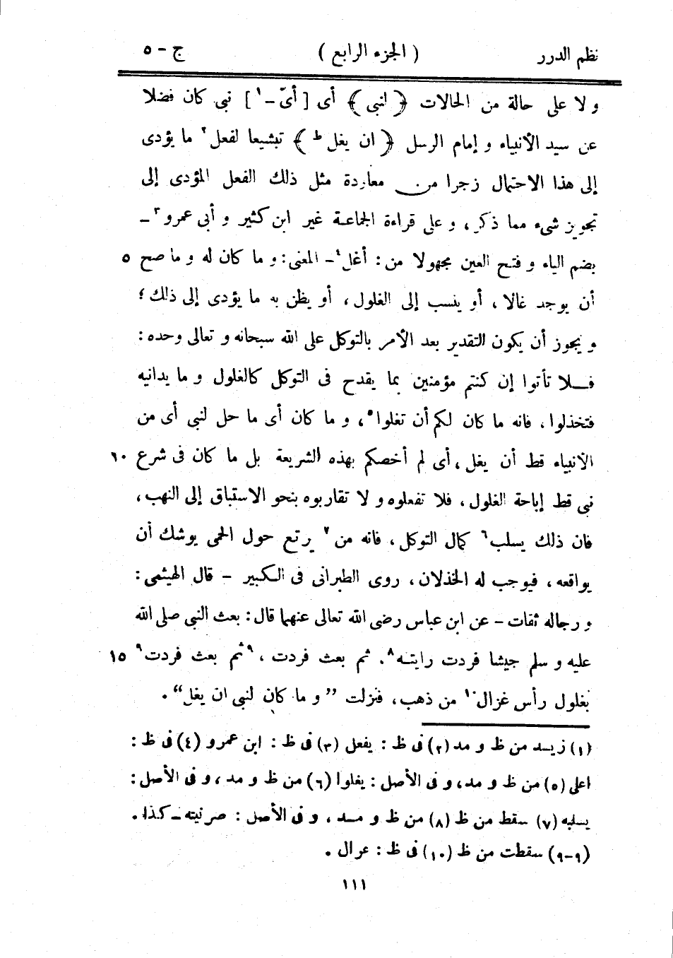 ولا على حالة من الحالات {لنبي} أي أي نبي كان فضلاً عن سيد الأنبياء وإمام الرسل {أن يغل} تبشيعاً لفعل ما يؤدي إلى هذا الاحتمال زجراً من معاودة مثل ذلك الفعل المؤدي إلى تجويز شيء مما ذكر، وعلى قراءة الجماعة غير ابن كثير وأبي عمرو - بضم الياء وفتح العين مجهولاً من: أغل - المعنى: وما كان له وما صح أن يوجد غالاً، أو ينسب إلى الغلول، أو يظن به ما يؤدي إلأى ذلك؛ ويجوز أن يكون التقدير بعد الأمر بالتوكل على الله سبحانه وتعالى وحده: فلا تأتوا إن كنتم مؤمنين بما يقدح في التوكل كالغلول وما يدانيه فتخذلوا، فإنه ما كان لكم أن تغلوا، وما كان أي ما حل لنبي أي من الأنبياء قط أن يغل، أي لم أخصكم بهذه الشريعة بل ما كان في شرع نبي قط إباحة الغلول، فلا تفعلوه ولا تقاربوه بنحو الاستباق إلى النهب، فإن ذلك يسلب كمال التوكل، فإنه من يرتع حول الحمى يوشك أن يواقعه، فيوجب له الخذلان، روى الطبراني في الكبير- قال الهيثمي: ورجاله ثقات - عن ابن عباس رضي الله تعالى عنهما قال: «بعث النبي صَلَّى اللهُ عَلَيْهِ وَسَلَّمَ جيشاً فردت رايته. ثم بعث فردت، ثم بعث فردت بغلول رأس غزال من ذهب، فنزلت {وما كان لنبي أن يغل} » .