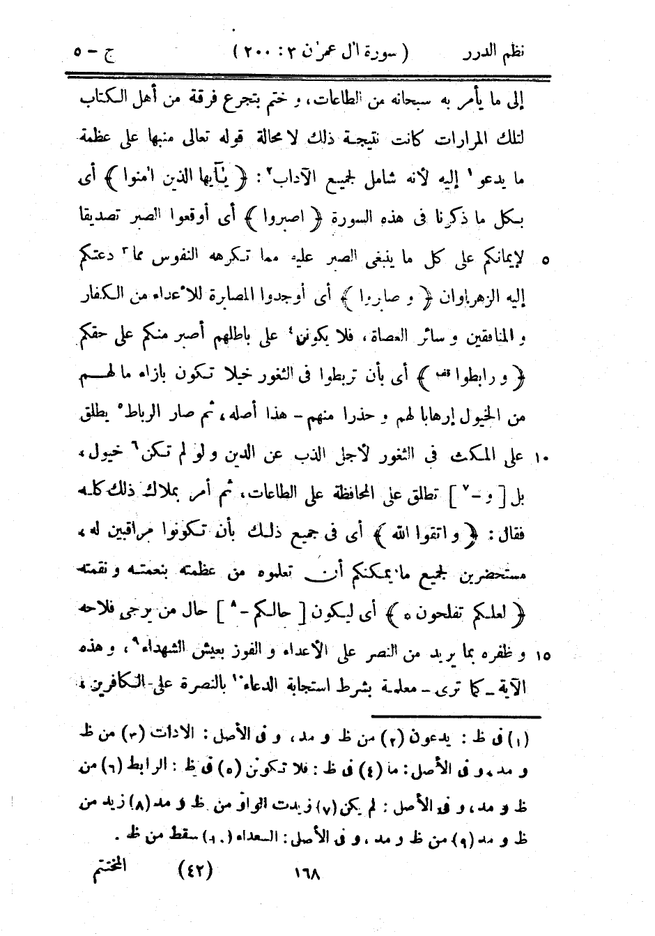 إلى ما يأمر به سبحانه من الطاعات، وختم بتجرع فرقة من أهل الكتاب لتلك المرارات كانت نتيجة ذلك لا محالة قوله تعالى منبهاً على عظمة ما يدعو إليه لأنه شامل لجميع الآداب: {يا أيها الذين آمنوا} أي بكل ما ذكرنا في هذه السورة {اصبروا} أي أوقعوا الصبر تصديقاً لإيمانكم على كل ما ينبغي الصبر عليه مما تكرهه النفوس مما دعتكم إليه الزهراوان {وصابروا} أي أوجدوا المصابرة للأعداء من الكفار والمنافقين وسائر العصاة، فلا يكونن على باطلهم أصبر منكم على حقكم {ورابطوا} أي بأن تربطوا في الثغور خيلاً بإزاء ما لهم من الخيول إرهاباً لهم وحذراً منهم - هذا أصله، ثم صار الرباط يطلق على المكث في الثغور لأجل الذب عن الدين ولو لم تكن خيول، بل وتطلق على المحافظة على الطاعات، ثم أمر بملاك ذلك كله فقال: {واتقوا الله} أي في جميع ذلك بأن تكونوا مراقبين له، مستحضرين لجميع ما يمكنكم أن تعلموه من عظمته بنعمته ونقمته {لعلكم تفلحون *} أي ليكون حالكم حال من يرجى فلاحه وظفره بما يريد من النصر على الأعداء والفوز بعيش الشهداء، وهذه الآية - كما ترى - معلمة بشرط استجابة الدعاء بالنصرة على الكافرين،
