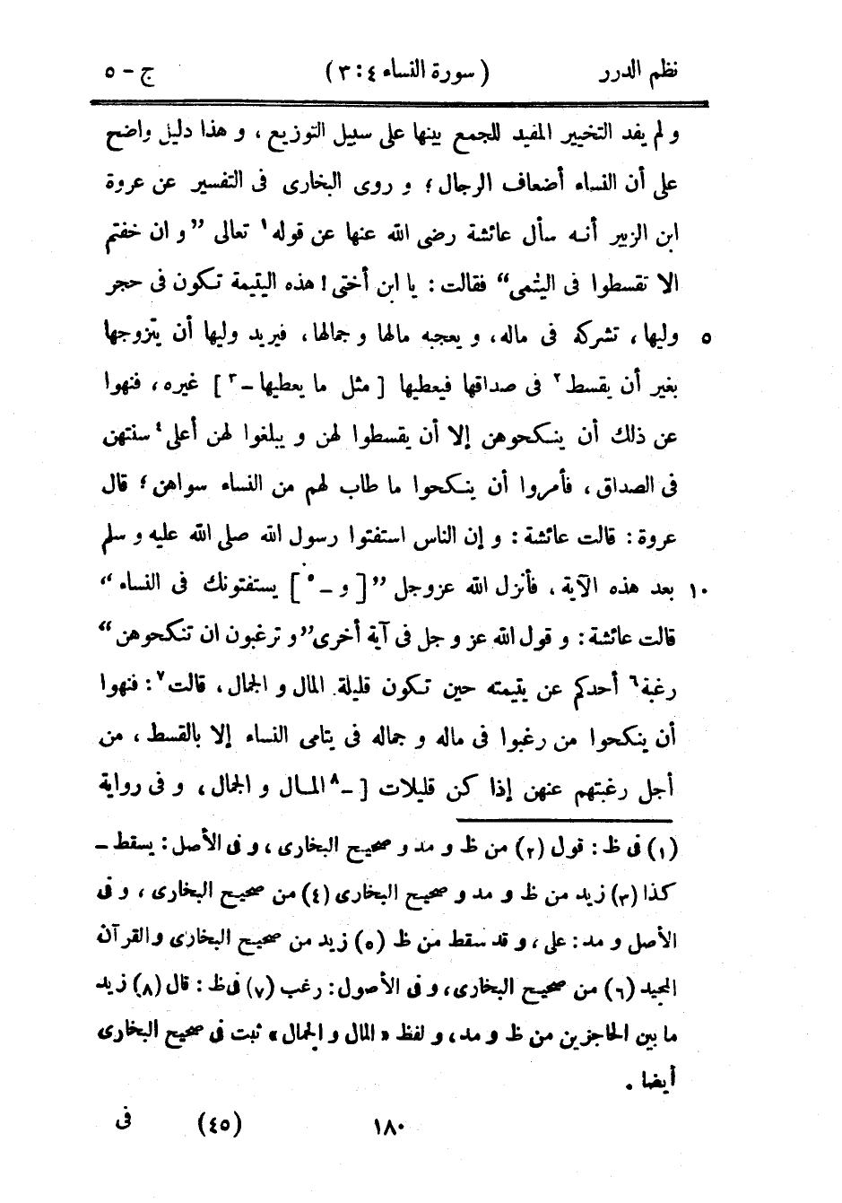 ولم يفد التخيير المفيد للجمع بينها على سبيل التوزيع، وهذا دليل واضح على أن النساء أضعاف الرجال، وروى البخاري في التفسير «عن عروة ابن الزبير أنه سأل عائشة رضي الله عنها عن قوله تعالى: {وإن خفتم ألا تقسطوا في اليتامى} [النساء: 3] ، فقالت: يا ابن أختي! هذه اليتيمة تكون في حجر وليها، تشركه في ماله، ويعجبه مالها وجمالها، فيريد وليها أن يتزوجها بغير أن يقسط في صداقها فيعطيها مثل ما يعطيها غيره، فنهوا عن ذلك أن ينكحوهن إلا أن يقسطوا لهن ويبلغوا لهن أعلى سنتهن في الصداق، فأمروا أن ينكحوا ما طاب لهم من النساء سواهن قال عروة: قالت عائشة: وإن الناس استفتوا رسول الله صَلَّى اللهُ عَلَيْهِ وَسَلَّمَ بعد هذه الآية، فأنزل الله عز وجل {ويستفتونك في النساء} [النساء: 127] قالت عائشة: وقول الله عز وجل في آية أخرى {وترغبون أن تنكحوهن} [النساء: 127] رغبة أحدكم عن يتيمته حين تكون قليلة المال والجمال، قالت: فنهوا أن ينكحوا من رغبوا في ماله وجماله في يتامى النساء إلا بالقسط، من أجل رغبتهم عنهم إذا كن قليلات المال والجمال» وفي رواية «