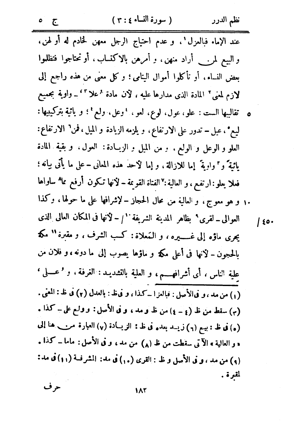 عند الإماء فالبعزل، وعدم احتياج الرجل معهن لخادم له أو لهن، والبيع لمن أراد منهن، وأمرهن بالاكتساب، أو تحتاجوا فتظلموا بعض النساء، أو تأكلوا أموال التيامى؛ وكل معنى من هذه راجع إلى لازم لمعنى المادة الذي مدارها عليه، لأن مادة «علا» - واوية بجميع تقاليبها الست: علو، عول، لوع، لعو، وعل، ولع؛ ويائية بتركيبيها: ليع، عيل تدور على الارتفاع، ويلزمه الزيادة والميل، فمن الارتفاع: العلو والوعل والولع، ومن الميل والزيادة: العول، وبقية المادة يائيةً وواويةً إما للإزالة، وإما لأحد هذه المعاني - على ما يأتي بيانه؛ فعلا يعلو: ارتفع، والعالية: الفتاة القويمة - لأ، ها تكون أرفع مما ساواها وهو معوج، والعالية من محال الحجاز - لإشرافها على ما حولها، وكذا العوالي - لقرى بظاهر المدينة الشريفة - لأنها في المكان العالي الذي يجري ماؤه إلى غيره، والمعلاة: كسب الشرف، ومقبرة مكة بالحجون - لأنها في أعلى مكة وماؤها يصوب إلى ما دونه، وفلان من علية الناس، أي أشرافهم، والعلية بالتشديد: الغرفة، وعلى
