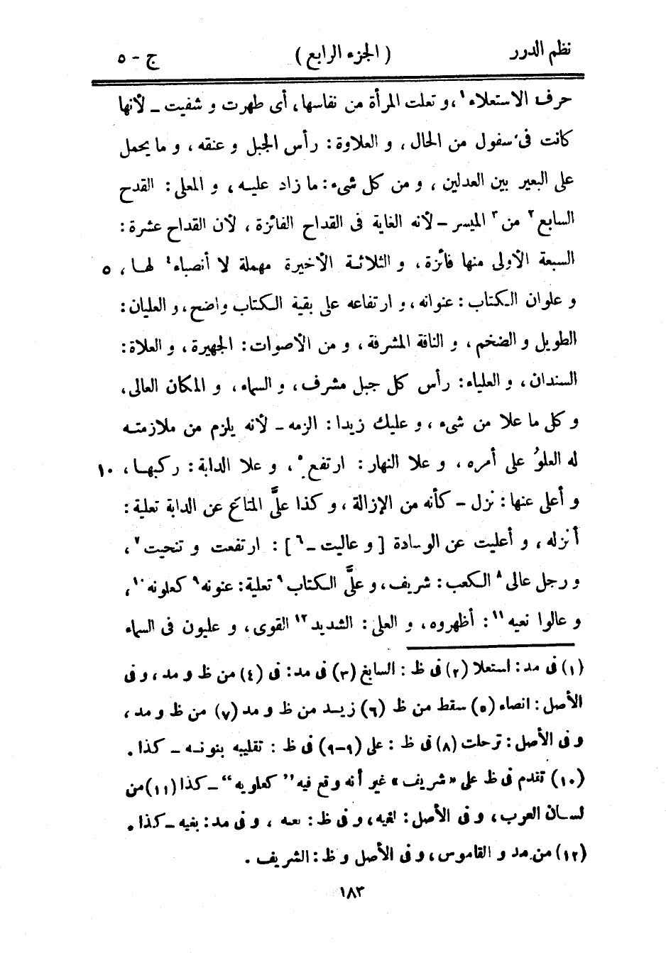 حرف الاستعلاء، وتعلت المرأة من نفاسها، أي طهرت وشفيت - لأنها كانت في سفول من الحال، والعلاوة: رأس الجبل وعنقه، وما يحمل على البعير بين العدلين، ومن كل شيء: ما زاد عليه، والمعلى: القدح السابع من الميسر - لأنه الغاية في القداح الفائزة، لأن القداح عشرة: السبعة الأولى منها فائزة، والثلاثة الأخيرة مهملة لا أنصباء لها، وعلوان الكتاب: عنوانه وارتفاعه على بقية الكتاب واضح، والعليان: الطويل والضخم، والناقة المشرفة، ومن الأصوات: الجهيرة، والعلاة: السندان، والعلياء: رأس كل جبل مشرف، والسماء، والمكان العالي، وكل ما علا من شيء، وعليك زيداً: الزمه - لأنه يلزم من ملازمته له العلو على أمره، وعلا النهار: ارتفع وعلا الدابة: ركبها وأعلى عنها: نزل - كأنه من الإزالة وكذا علَّى المتاع عن الدابة تعلية: أنزله، وأعليت عن الوسادة وعاليت: ارتفعت وتنحيت، ورجل عالي الكعب: شريف، وعلَّى الكتاب تعلية: عنونه كعلونه، وعالوا نعيه: أظهروه، والعلي: الشديد القوي، وعليون في السماء