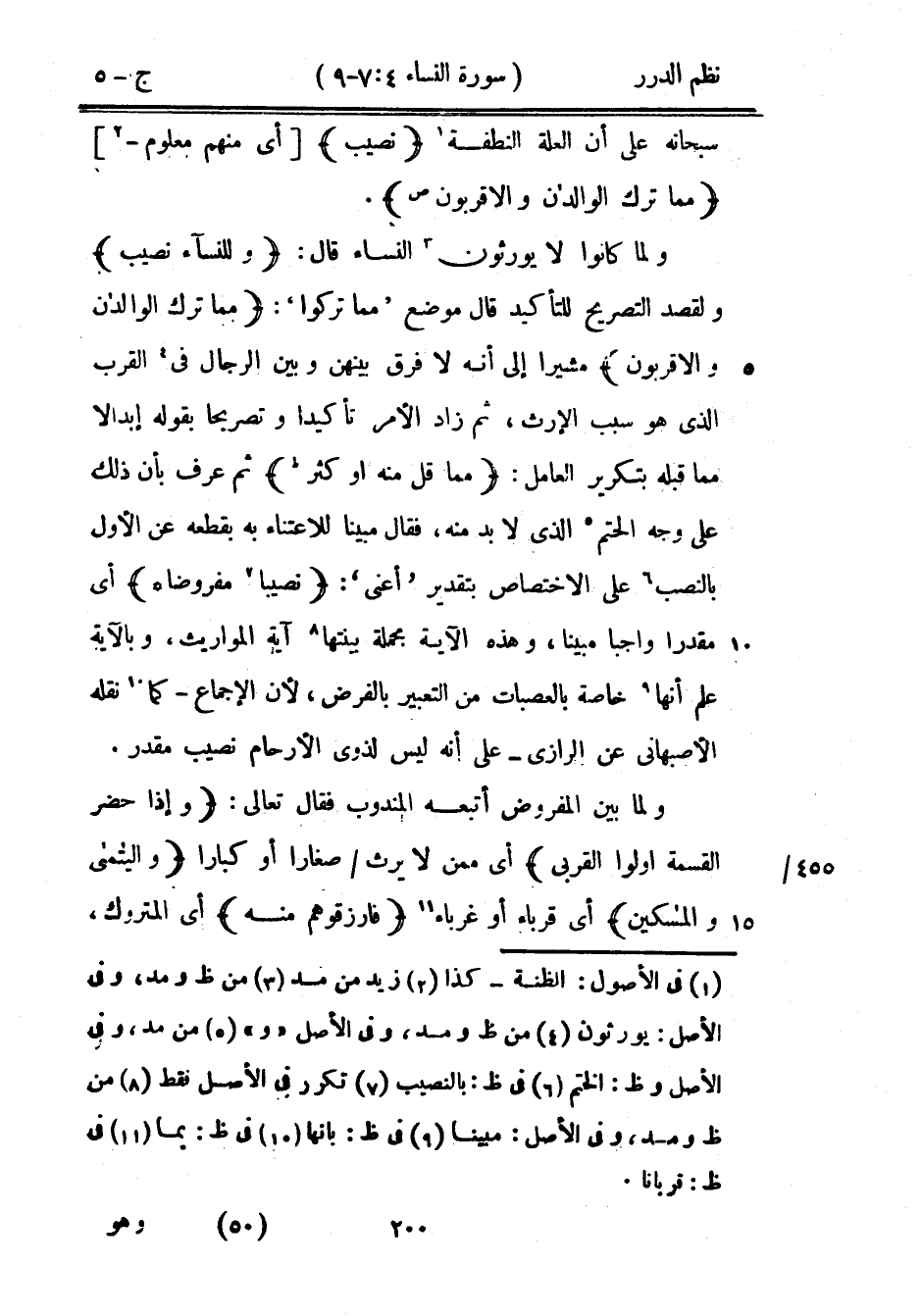 ولما كانوا لا يورثون النساء قال: {وللنساء نصيب} ولقصد التصريح للتأكيد قال موضع «مما تركوا» : {مما ترك الوالدان والأقربون} مشيراً إلى أنه لا فرق بينهن وبين الرجال في القرب الذي هو سبب الإرث، ثم زاد الأمر تأكيداً وتصريحاً بقوله إبدالاً مما قبله بتكرير العامل: {مما قل منه أو كثر} ثم عرف بأن ذلك على وجه الحتم الذي لا بد منه، فقال مبيناً للاعتناء به بقطعه عن الأول بالنصب على الاختصاص بتقدير أعني: {نصيباً مفروضاً *} أي مقدراً واجباً مبيناً، وهذه الآية مجملة بينتها آية المواريث، وبالآية علم أنها خاصة بالعصبات من التعبير بالفرض لأن الإجماع - كما نقله الأصبهاني عن الرازي - على أنه ليس لذوي الأرحام نصيب مقدر.