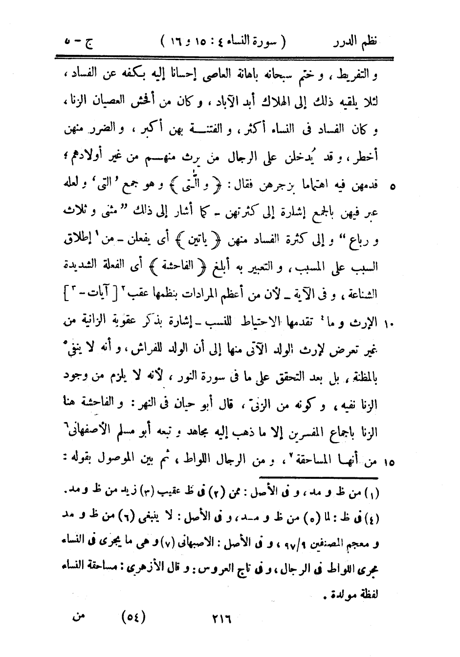 والتفريط، وختم سبحانه بإهانة العاصي إحساناً إليه بكفه عن الفساد، لئلا يلقيه ذلك إلى الهلاك أبد الآباد، وكان من أفحش العصيان الزنى، وكان الفساد في النساء أكثر، والفتنة بهن أكبر، والضرر منهن أخطر، وقد يدخلن على الرجال من يرث منهم من غير أولادهم؛ قدمهن فيه اهتماماً بزجرهن فقال: {واللاتي} وهو جمع «التي» ولعله عبر فيهن بالجمع إشارة إلى كثرتهن - كما أشار إلى ذلك