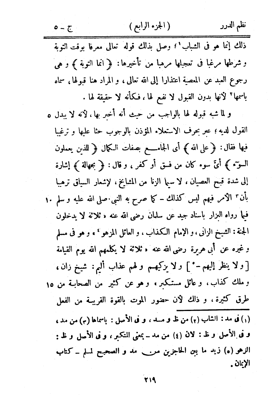 «ثلاثة لا يكلمهم الله يوم القيامة ولا ينظر إليهم ولا يزكيهم ولهم عذاب أليم: شيخ زان، وملك كذاب، وعائل مستكبر» وهو عن كثير من الصحابة من طرق كثيرة، وذلك لأن حضور الموت بالقوة القريبة من الفعل