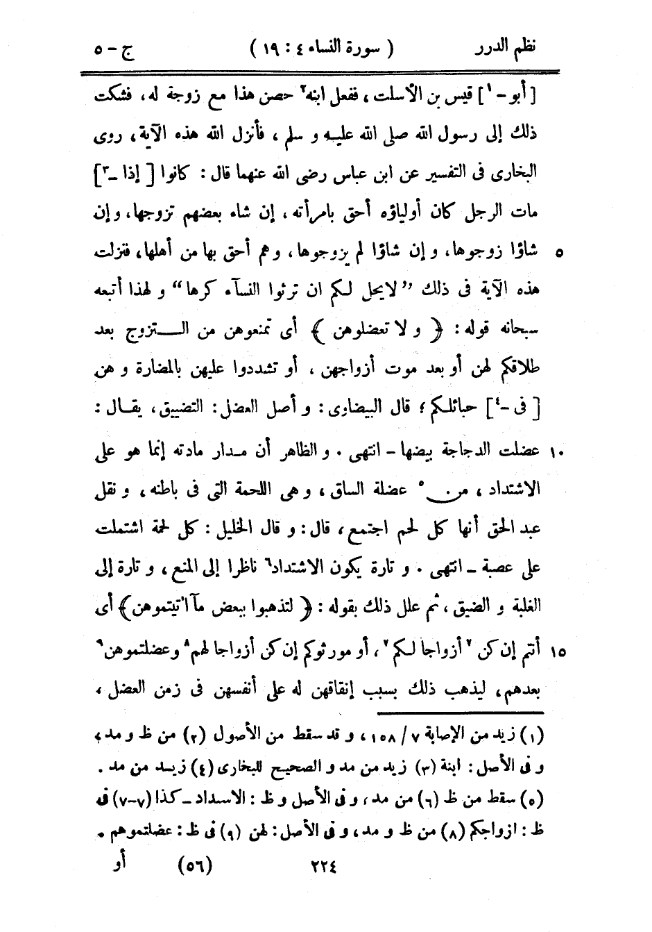 أبو قيس بن الأسلت، ففعل ابنه حصن هذا مع زوجة له، فشكت ذلك إلى رسول الله صَلَّى اللهُ عَلَيْهِ وَسَلَّمَ، فأنزل الله هذه الآية، روى البخاري في التفسير عن ابن عباس رضي الله عنهما قال؛ «كانوا إذا مات الرجل كان أولياؤه أحق بامرأته، إن شاء بعضهم تزوجها، وإن شاؤوا زوجوها، وإن شاؤوا لم يزوجوها، وهم أحق بها من أهلها، فنزلت هذه الآية في ذلك {لا يحل لكم أن ترثوا النساء كرهاً} » ولهذا أتبعه سبحانه قوله: {ولا تعضلوهنَّ} أي تمنعوهن من التزوج بعد طلاقكم لهن أو بعد موت أزواجهن، أوتشددوا عليهن بالمضارة وهن في حبائلكم؛ قال البيضاوي: وأصل العضل: التضييق، يقال عضلت الدجاجة بيضها - انتهى. والظاهر أن مدار مادته إنما هو على الاشتداد، من عضلة الساق، وهي اللحمة التي في باطنه، ونقل عبد الحق أنها كل لحم اجتمع، قال: وقال الخليل: كل لحمة اشتملت على عصبة - انتهى. وتارة يكون الاشتداد ناظراً إلى المنع، وتارة إلى الغلبة والضيق، ثم علل ذلك بقوله: {لتذهبوا ببعض ما آتيتموهن} أي أنتم إن كن أزواجاً لكم، أو مورثوكم إن كن أزواجاً لهم وعضلتموهن بعدهم، ليذهب ذلك بسبب إنفاقهن له على أنفسهن في زمن العضل،