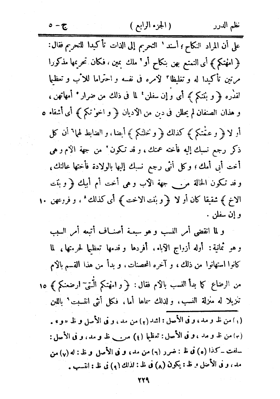 ولما انقضى أمر النسب وهو سبعة أصناف أتبعه أمر السبب وهو ثمانية: أوله أزواج الآباء، أفردها وقدمها تعظيماً لحرمتها، لما كانوا استهانوا من ذلك، وآخره المحصنات، وبدأ من هذا القسم بالأم من الرضاع كما بدأ النسب بالأم فقال: {وأمهاتكم اللاَّتي أرضعنكم} تنزيلاً له منزلة النسب، ولذلك سماها أمّاً، فكل أنثى انتسب باللبن