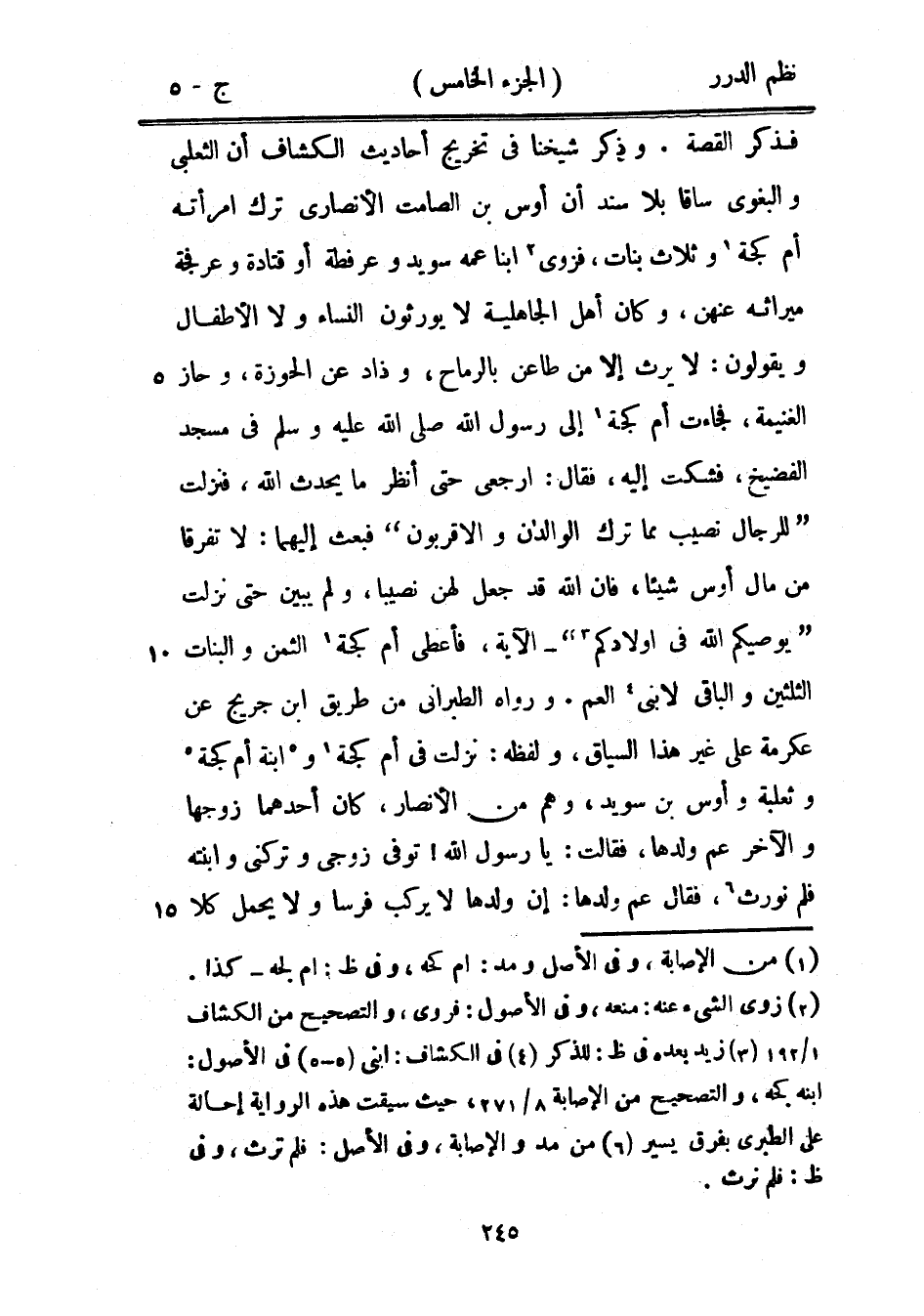 فذكر القصة «وذكر شيخنا في تخريج أحاديث الكشاف أن الثعلبي والبغوي ساقا بلا سند أن أوس بن الصامت الأنصاري ترك امرأته أم كجة وثلاث بنات، فزوى ابنا عمه سويد وعرفطه أو قتادة وعرفجة ميراثة عنهن، وكان أهل الجاهلية لا يورثون النساء ولا الأطفال ويقولون: لا يرث إلا من طاعن بالرماح، وذاد عن الحوزة، وحاز الغنيمة، فجاءت أم كجة إلى رسول الله صَلَّى اللهُ عَلَيْهِ وَسَلَّمَ في مسجد الفضيخ، فشكت إليه، فقال: ارجعي حتى أنظر ما يحدث الله، فنزلت
