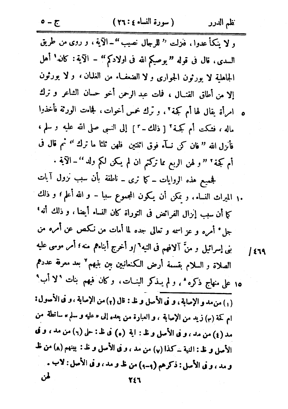 فجميع هذه الروايات - كما ترى - ناطقة بأن سبب نزول آيات الميراث النساء، ويمكن أن يكون المجموع سبباً - والله أعلم؛ وذلك كما أن سبب إنزال الفرائض في التوراة كان النساء أيضاً، وذلك أنه جل أمره وعز اسمه وتعالى جده لما أمات من نكص عن أمره من بني إسرائيل ومن آلافهم في التيه وأخرج أبناءهم منه؛ أمر موسى عليه الصلاة والسلام بقسمة أرض الكنعانيين بين بنيهم بعد معرفة عددهم على منهاج ذكره، ولم يذكر البنات، وكان فيهم بنات لا أب