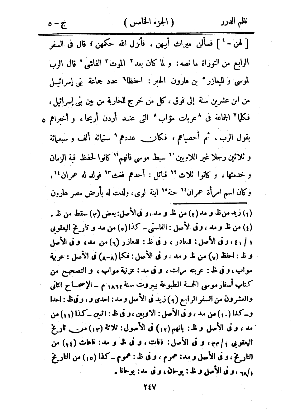 لهن فسألن ميراث أبيهن، فأنزل الله حكمهن؛ قال في السفر الرابع من التوراة ما نصه: ولما كان بعد الموت الفاشي قال الرب لموسى ولليعازر بن هارون الحبر: احفظا عدد جماعة بني إسرائيل من ابن عشرين سنة إلى فوق، كل من خرج للمحاربة من بين بني إسرائيل فكلما الجماعة في عربات مؤاب التي عند أردن أريحا، وأخبراهم بقول الرب، ثم أحصياهم، فكان عددهم ستمائة ألف وسبعمائة وثلاثين رجلاً غير اللاويين سبط موسى فإنهم كانوا لحفظ قبة الزمان وخدمتها، وكانوا ثلاث قبائل: أحدهم فغث فولد له عمران، وكان اسم امرأة عمران حنة ابنة لوى، ولدت له بأرض مصر هارون