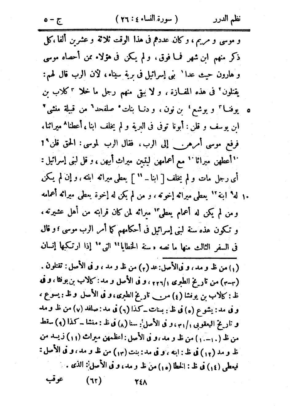 وموسى ومريم، وكان عددهم في هذا الوقت ثلاثة وعشرين ألفاً، كل ذكر منهم ابن شهر فما فوق، ولم يكن في هؤلاء ممن أحصاه موسى وهارون حيث عدا بني إسرائيل في برية سيناء، لأن الرب قال لهم: يقتلون في هذه المفازة، ولا يبقى منهم رجل ما خلا كلاب بن يوفنا ويوشع بن نون، ودنا بنات صلفحد من قبيلة منشى بن يوسف وقلن: أبونا توفي في البرية ولم يخلف ابناً، أعطنا ميراثنا، فرفع موسى أمرهن إلى الرب فقال الرب لموسى: الحق قلن أعطهن ميراثاً مع أعمامهن ليتبين ميراث أبيهن وقلن لبني إسرائيل: أي رجل مات ولم يخلف ابناً يعطى ميراثه ابنته وإن لم يكن له ابنة يعطى ميراثه إخوته ومن لم يكن له إخوة يعطى ميراثه أعمامه ومن لم يكن له أعمام يعطى ميراثه لمن كان قرابته من أهل عشيرته، وتكون هذه سنة لبني إسرائيل في أحكامهم كما أمر الرب موسى؛ وقال في السفر الثالث منها ما نصه سنة الخطايا التي إذا ارتكبها إنسان