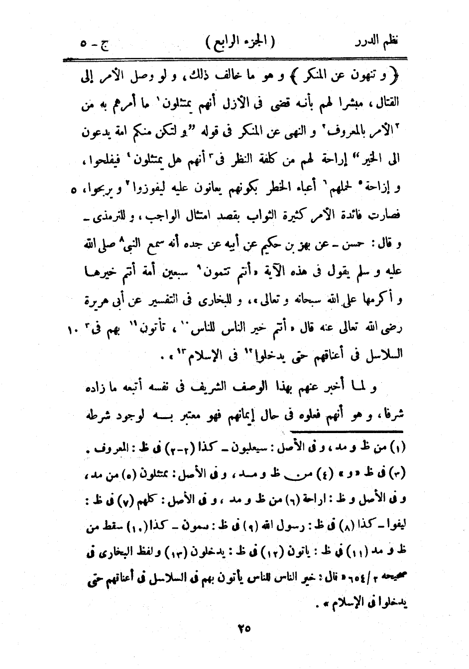 {وتنهون عن المنكر} وهو ما خالف ذلك، ولو وصل الأمر إلى القتال، مبشراً لهم بأنه قضى في ألأزل أنهم يمتثلون ما أمرهم به من الأمر بالمعروف والنهي عن المنكر في قوله: {ولتكن منكم أمة يدعون إلى الخير} إراحة لهم من كلفة النظر في أنهم هل يمتثلون فيفلحوا، وإزاحة لحملهم أعباء الخطر بكونهم يعانون عليه ليفوزوا ويربحوا، فصارت فائدة الأمر كثيرة الثواب بقصد امتثال الواجب، وللترمذي - وقال: حسن عن بهز بن حكيم عن أبيه عن جده أنه سمع النبي صلى الله عليه يقول في هذه الآية: «أنتم تتمون سبعين أمة أنتم خيرها وأكرمها على الله سبحانه وتعالى» وللبخاري في التفسير عن أبي هريرة رضي الله تعالى عنه قال: «أنتم خير الناس للناس، تأتون بهم في السلاسل في أعناقهم حتى يدخلوا في الإسلام» .