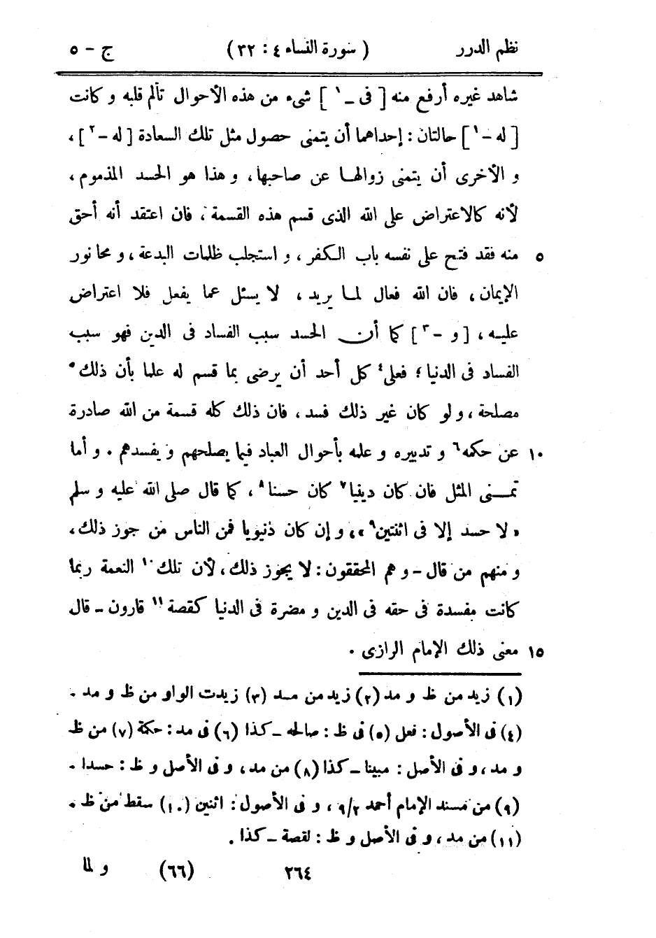 وأما تمني المثل فإن كان دينياً كان حسناً، كما قال صَلَّى اللهُ عَلَيْهِ وَسَلَّمَ «لا حسد إلا في اثنتين» وإن كان دنيوياً فمن الناس من جوز ذلك، ومنهم من قال - وهم المحققون: لا يجوز ذلك، لأن تلك النعمة ربما كانت مفسدة في حقه في الدين ومضرة في الدنيا كقصة قارون - قال معنى ذلك الإمام الرازي.