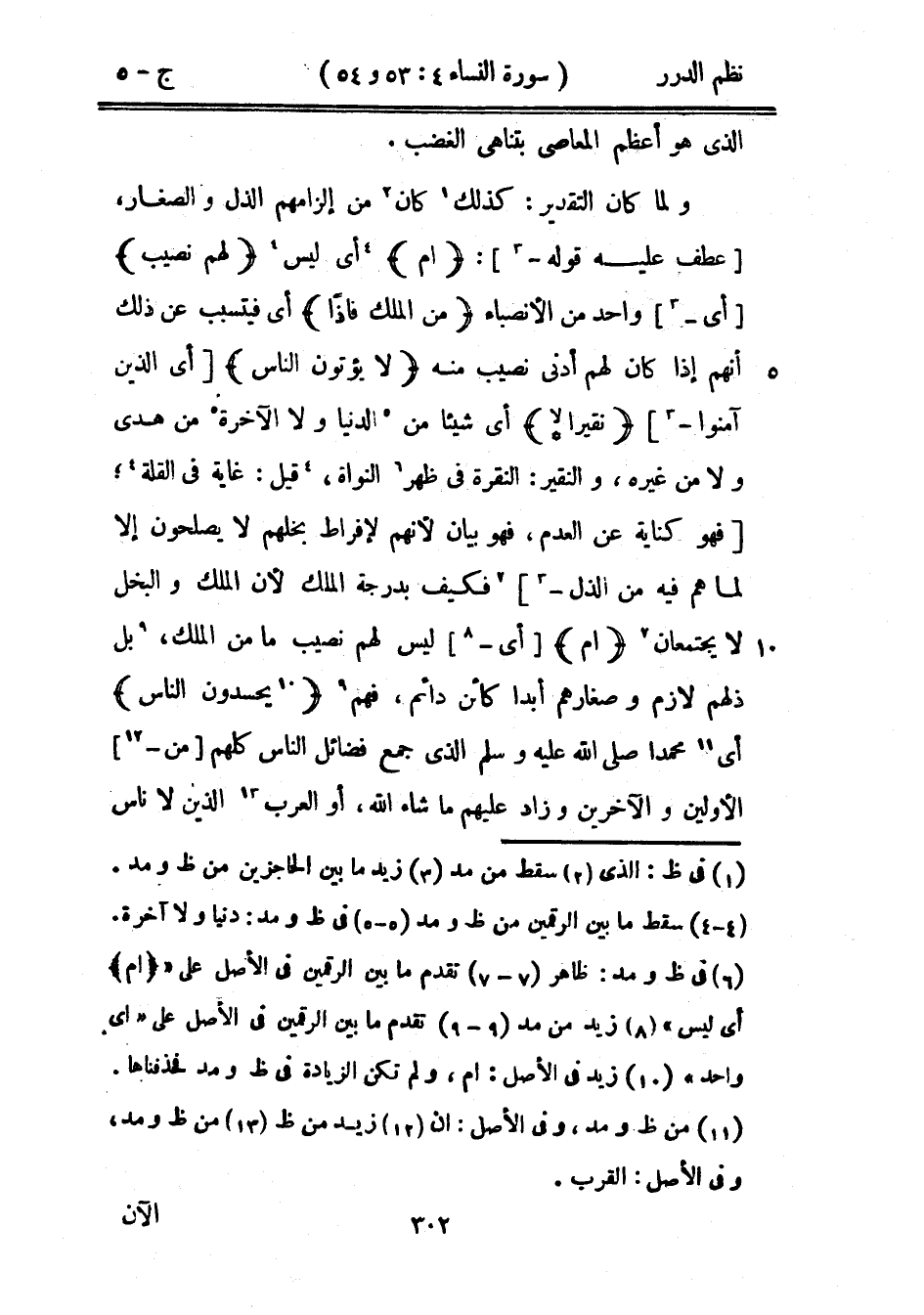 ولما كان التقدير: كذلك كان من إلزامهم الذل والصغار، عطف عليه قوله: {أم} أي ليس {لهم نصيب} أي واحد من الأنصباء {من الملك فإذاً} أي فيتسبب عن ذلك أنهم إذا كان لهم أدنى نصيب منه {لا يؤتون الناس} أي الذين آمنوا {نقيراً *} أي شيئاً من الدنيا ولا الآخرة من هدى ولا من غيره، والنقير: النقرة في ظهر النواة، قيل: غاية في القلة؛ فهو كناية عن العدم، فهو بيان لأنهم لإفراط بخلهم لا يصلحون إلا لما هم فيه من الذل فكيف بدرجة الملك لأن الملك والبخل لا يجتمعان {أم} أي ليس لهم نصيب ما من الملك، بل ذلهم لازم وصغارهم أبداً كائن دائم، فهم {يحسدون الناس} أي محمداً صَلَّى اللهُ عَلَيْهِ وَسَلَّمَ الذي جمع فضائل الناس كلهم من الأولين والآخرين وزاد عليهم ما شاء الله، أو العرب الذي لا ناس
