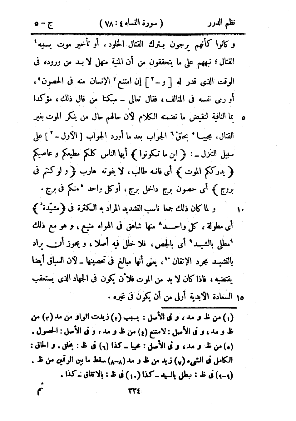 ولما كان ذلك جمعاً ناسب التشديد المراد به الكثرة في {مشيّدة} أي مطولة، كل واحد منها شاهق في الهواء منيع، وهو مع ذلك مطلي بالشيد أي بالجص، فلا خلل فيه أصلاً، ويجوز أن يراد بالتشيد مجرد الإتقان، يعني أنها مبالغ في تحصينها - لأن السياق أيضاً يقتضيه، فإذا كان لا بد من الموت فلأن يكون في الجهاد الذي يستعقب السعادة الأبدية أولى من أن يكون في غيره.