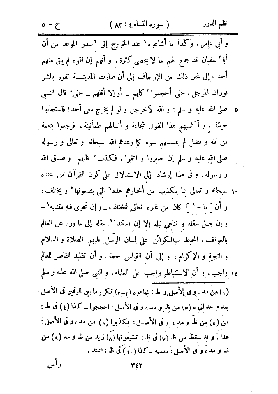 «والله لأخرجن ولو لم يخرج معي أحد» فاستجابوا حينئذ، وأكسبهم هذا القول شجاعة وأنالهم طمأنينة، فرجعوا بنعمة من الله وفضل لم يمسسهم سوء كما وعدهم الله سبحانه وتعالى ورسوله صَلَّى اللهُ عَلَيْهِ وَسَلَّمَ إن صبروا واتقوا، فكذب ظنهم وصدق الله ورسوله، وفي هذا إرشاد إلى الاستدلال على كون القرآن من عنده سبحانه وتعالى بما يكذب من أخبارهم هذه التي يشيعونها ويختلف، وأن ما كان من غيره تعالى فمختلف - وإن تحرى فيه متشبه - وإن دل عقله وتناهي نبله إلا أن استند عقله إلى ما ورد عن العالم بالعواقب، المحيط بالكوائن على لسان الرسل عليهم الصلاة والسلام والتحية والإكرام، وإلى أن القياس حجة. وأن تقليد القاصر للعالم واجب، وأن الاستنباط واجب على العلماء، والنبي صَلَّى اللهُ عَلَيْهِ وَسَلَّمَ