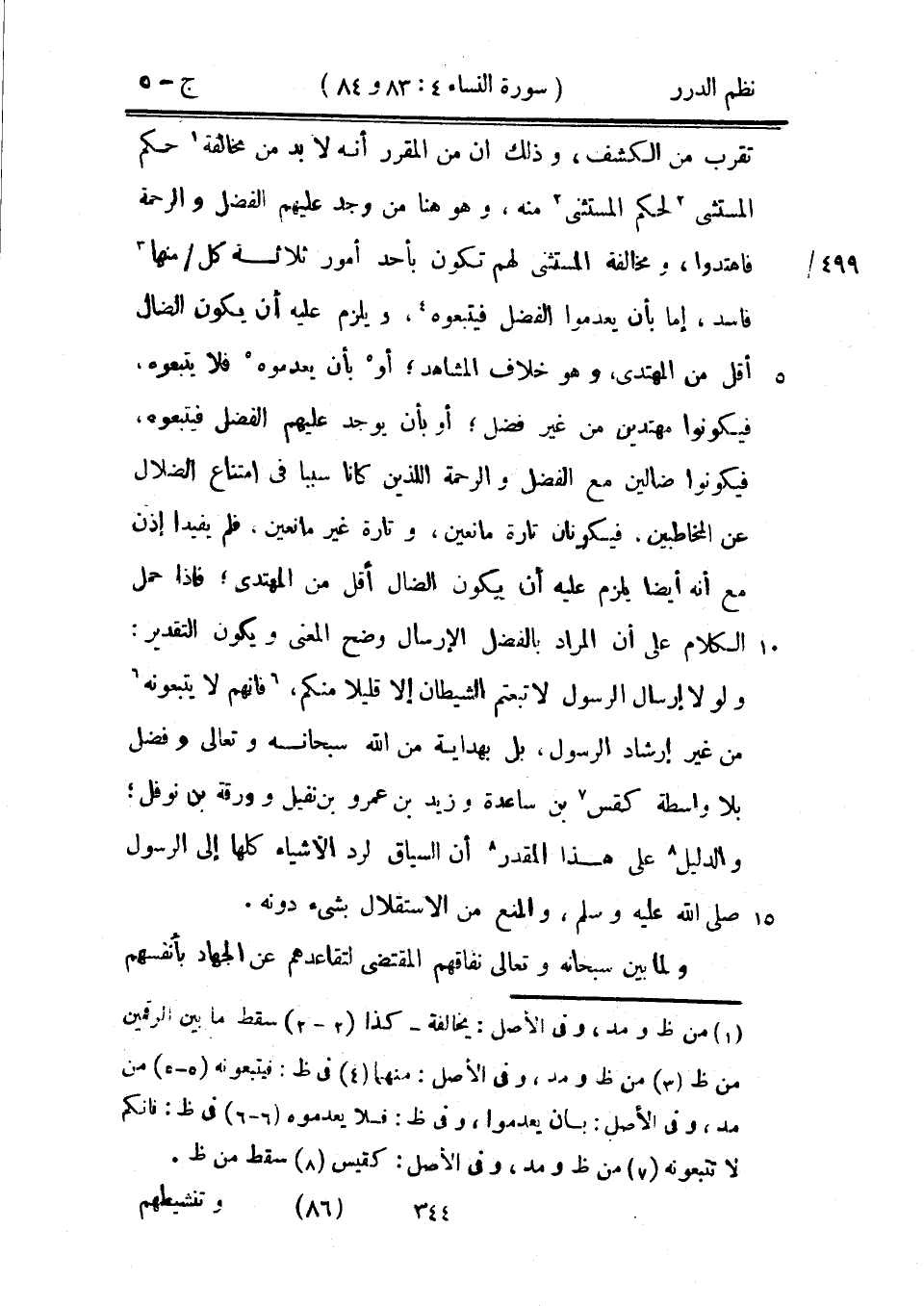 فيكونان تارة مانعين، وتارة غير مانعين، فلم يفيدا إذن مع أن أيضاً يلزم عليه أن يكون الضال أقل من المهتدي؛ فإذا حمل الكلام على أن المراد بالفضل الإرسال وضح المعنى ويكون التقدير: ولولا إرسال الرسول لاتبعتم الشيطان إلا قليلاً منكم، فإنهم لا يتبعونه من غير إرشاد الرسول، بل بهداية من الله سبحانه وتعالى وفضل بلا واسطة كقس بن ساعدة وزيد بن عمرو بن نفيل وورقة بن نوفل؛ والدليل على هذا المقدر أن السياق لرد الأشياء كلها إلى الرسول صَلَّى اللهُ عَلَيْهِ وَسَلَّمَ، والمنع من الاستقلال بشيء دونه.