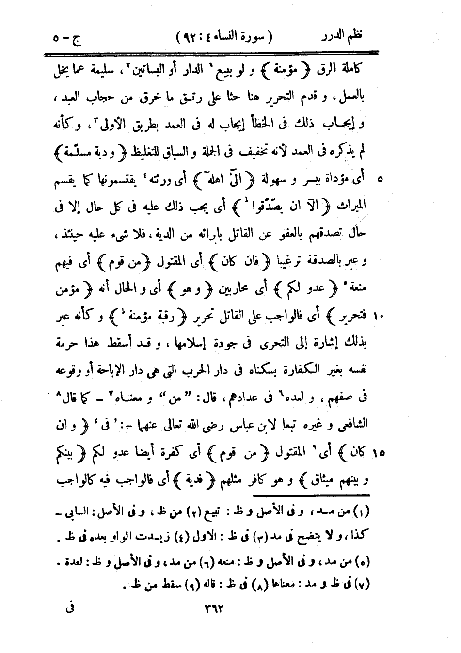 كاملة الرق {مؤمنة} ولو ببيع الدار أو البساتين، سليمة عما يخل بالعمل، وقدم التحرير هنا حثاً على رتق ما خرق من حجاب العبد، وإيجاب ذلك في الخطأ إيجاب له في العمد بطريق الأولى، وكأنه لم يذكره في العمد لأنه تخفيف في الجملة والسياق للتغليظ {ودية مسلّمة} أي مؤداة بيسر وسهولة {إلى أهله} أي ورثته يقتسمونها كما يقسم الميراث {إلا أن يصدّقوا} أي يجب ذلك عليه في كل حال إلا في حال تصدقهم بالعفو عن القاتل بإبرائه من الدية، فلا شيء عليه حينئذ، وعبر بالصدقة ترغيباً {فإن كان} أي المقتول {من قوم} أي فيهم منعة {عدو لكم} أي محاربين {وهو} أي والحال أنه {مؤمن فتحرير} أي فالواجب على القاتل تحرير {رقبة مؤمنة} وكأنه عبر بذلك إشارة إلى التحري في جودة إسلامها، وقد أسقط هذا حرمة نفسه بغير الكفارة بسكناه في دار الحرب التي هي دار الإباحة أو وقوعه في صفهم، ولعده في عدادهم قال: {من} ومعناه - كما قال الشافعي وغيره تبعاً لابن عباس رضي الله تعالى عنهما -: في {وإن كان} أي المقتول {من قوم} أي كفرة أيضاً عدو لكم {بينكم وبينهم ميثاق} وهو كافر مثلهم {فدية} أي فالواجب فيه كالواجب