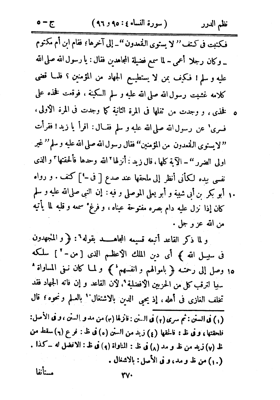 فكتبت في كتف {لا يستوي القاعدون} إلى آخرها؛ فقام ابن أم مكتوم - وكان رجلاً أعمى - لما سمع فضيلة المجاهدين فقال: يا رسول الله صَلَّى اللهُ عَلَيْهِ وَسَلَّمَ! فكيف بمن لا يستطيع الجهاد من المؤمنين؟ فلما قضى كلامه غشيت رسول الله صَلَّى اللهُ عَلَيْهِ وَسَلَّمَ السكينة، فوقعت فخذه على فخذي، ووجدت من ثقلها في المرة الثانية كما وجدت في المرة الأولى، فسرى عن رسول الله صَلَّى اللهُ عَلَيْهِ وَسَلَّمَ فقال: اقرأ يا زيد! فقرأت {لا يستوي القاعدون من المؤمنين} فقال رسول الله صَلَّى اللهُ عَلَيْهِ وَسَلَّمَ {غير أولي الضرر} - الآية كلها، قال زيد: أنزلها الله وحدها فألحقتها والذي نفسي بيده لكأني أنظر إلى ملحقها عند صدع في كتف» ورواه أبو بكر ابن أبي شيبة وأبو يعلى الموصلي وفيه: «إن النبي صَلَّى اللهُ عَلَيْهِ وَسَلَّمَ كان إذا نزل عليه دام بصره مفتوحة عيناه، وفرغ سمعه وقلبه لما يأتيه من الله عز وجل» .