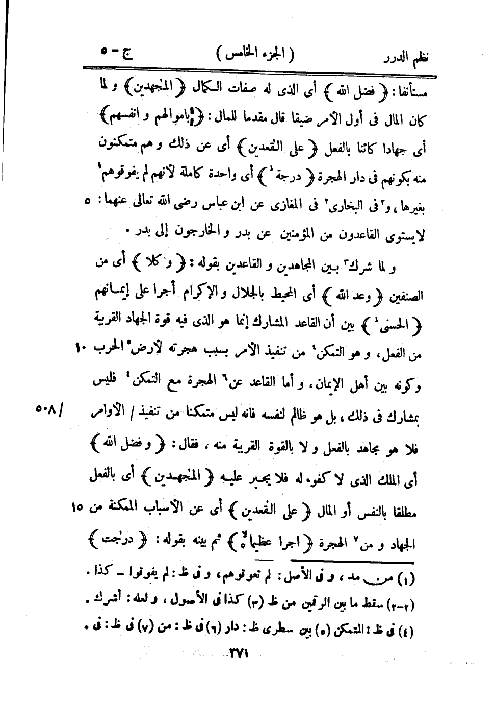 متسأنفاً: {فضل الله} أي الذي له صفات الكمال {المجاهدين} ولما كان المال في أول الأمر ضيقاً قال مقدماً للمال: {بأموالهم وأنفسهم} أي جهاداً كائناً بالفعل {على القاعدين} أي عن ذلك وهم متمكنون منه بكونهم في دار الهجرة {درجة} أي واحدة كاملة لأنهم لم يفوقوهم بغيرها، وفي البخاري في المغازي عن ابن عباس رضي الله تعالى عنهما:
