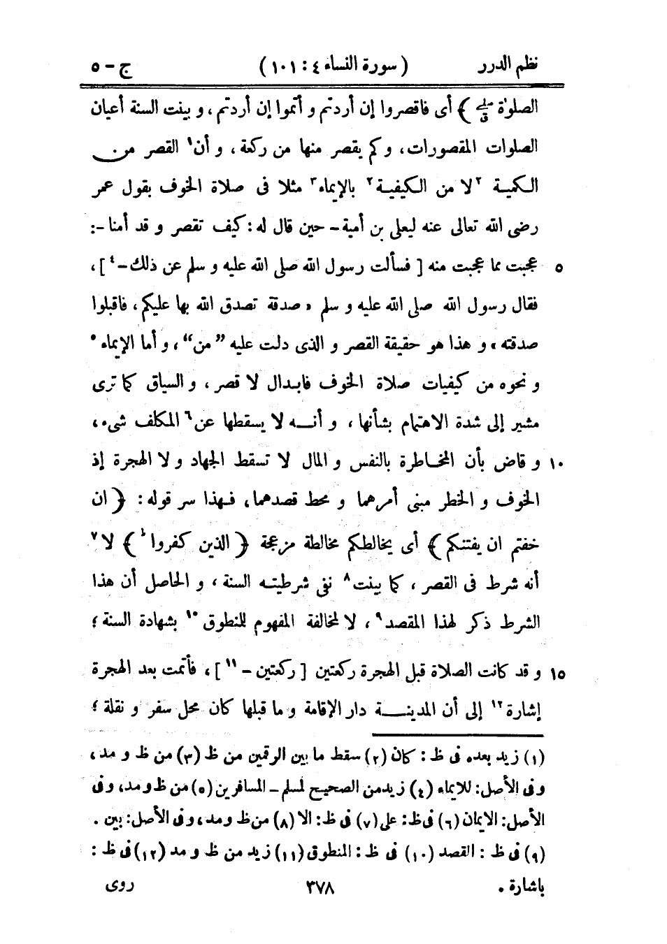 الصلاة} أي فاقصروا إن أردتم وأتموا إن أردتم، وبينت السنة أعيان الصلوات المقصورات، وكم يقصر منها من ركعة، وأن القصر من الكمية لا من الكيفية بالإيماء مثلاً في صلاة الخوف بقول عمر رضي الله تعالى عنه ليعلى بن أمية - حين قال له: كيف تقصر وقد أمنا -: عجبت مما عجبت منه فسألت رسول الله صَلَّى اللهُ عَلَيْهِ وَسَلَّمَ عن ذلك -، فقال رسول الله صَلَّى اللهُ عَلَيْهِ وَسَلَّمَ «صدقة تصدق الله بها عليكم، فاقبلوا صدقته» وهذا هو حقيقة القصر والذي دلت عليه «من» ، وأما الإيماء ونحوه من كيفيات صلاة الخوف فإبدال لا قصر، والسياق كام ترى مشير إلى شدة الاهتمام بشأنها، وأنه لا يسقطها عن المكلف شيء، وقاض بأن المخاطرة بالنفس والمال لا تسقط الجهاد ولا الهجرة إذ الخوف والخطر مبنى أمرهما ومحط قصدهما، فهذا سر قوله: {وإن خفتم أن يفتنكم} أي يخالطم مخالطة مزعجة {الذين كفروا} لا أنه شرط في القصر، كما بينت نفي شرطيته السنة، والحاصل أن هذا الشرط ذكر لهذا المقصد، لا لمخالفة المفهوم للمنطوق بشهادة السنة؛ وقد كانت الصلاة قبل الهجرة ركعتين ركعتين، فأتمت بعد الهجرة إشارة إلى أن المدينة دار الإقامة وما قبلها كان محل سفر ونقلة؛