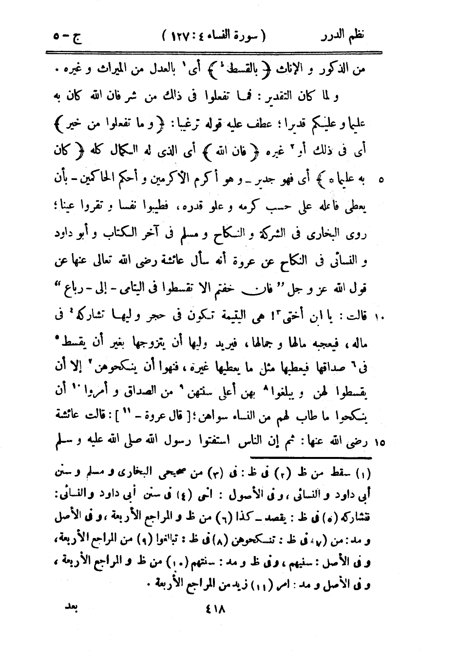 ولما كان التقدير: فما تفعلوا في ذلك من شر فإن الله كان به عليماً وعليكم قديراً؛ عطف عليه قوله ترغيباً: {وما تفعلوا من خير} أي في ذلك أو في غيره {فإن الله} أي الذي له الكمال كله {كان به عليماً *} أي فهو جدير - وهو أكرم الأكرمين وأحكم الحاكمين - بأن يعطي فاعله على حسب كرمه وعلو قدره، فطيبوا نفساً وتقروا عيناً؛ روى البخاري في الشركة والنكاح ومسلم في آخر الكتاب وأبو داود والنسائي في النكاح «عن عروة أنه سأل عائشة رضي الله تعالى عنها عن قول الله عز وجل: {فإن خفتم ألا تقسطوا في اليتامى} إلى {رباع} قالت: يا ابن أختي! هي اليتيمة تكون في حجر وليها تشاركه في ماله، فيعجبه مالها وجمالها، فيريد وليها أن يتزوجها بغير أن يقسط في صداقها فيعطيها مثل ما يعطيها غيره، فنهوا أن ينكحوهن إلا أن يقسطوا لهن ويبلغوا بهن أعلى سنتهن من الصداق وأمروا أن ينكحوا ما طاب لهم من النساء سواهن؛ قال عروة: قالت عائشة رضي الله عنها: ثم إن الناس استفتوا رسول الله صَلَّى اللهُ عَلَيْهِ وَسَلَّمَ