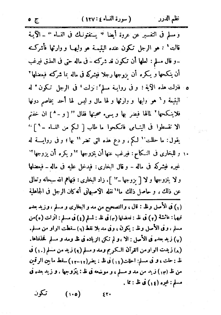 ومسلم في التفسير عن عروة أيضاً {يستفتونك في النساء} الآية قالت: «هو الرجل تكون عنده اليتيمة هو وليها ووارثها فأشركته - وقال مسلم: لعلها أن تكون قد شركته، في ماله حتى في العذق فيرغب أن ينكحها ويكره أن يزوجها رجلاً فيشركه في ماله بما شركته فيعضلها فنزلت هذه الآية؛ وفي رواية مسلم: نزلت في الرجل تكون له اليتيمة وهو وليها ووارثها ولها مال وليس لها أحد يخاصم دونها فلا ينحكها لمالها فيضر بها ويسيء صحبتها فقال: {وإن خفتم ألا تقسطوا في اليتامى فانكحوا ما طاب لكم من النساء} يقول: ما حللت لكم، ودع هذه التي تضر بها» وفي رواية له وللبخاري في النكاح «فيرغب عنها أن يتزوجها ويكره أن يزوجها غيره فيشركه في ماله - وقال البخاري: فيدخل عليه في ماله - فيعضلها ولا يتزوجها ولا يزوجها، زاد البخاري: فنهاهم الله سبحانه وتعالى» عن ذلك، وحاصل ذلك ما نقله الأصبهاني أنه كان الرجل في الجاهلية