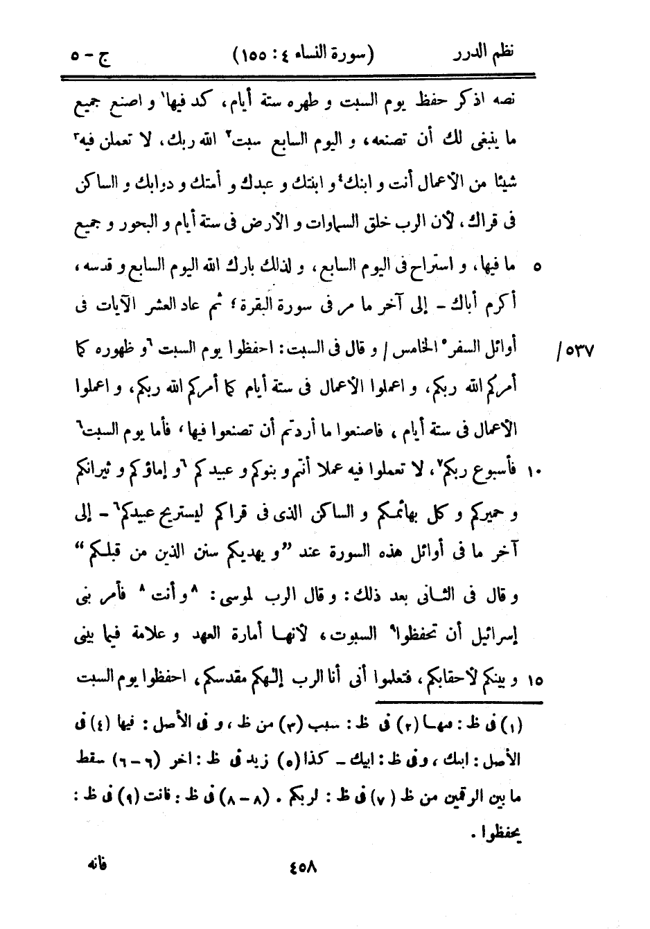 نصه: اذكر حفظ يوم السبت وطهره ستة أيام، كد فيها واصنع جميع ما ينبغي لك أن تصنعه، واليوم السابع سبت الله ربك، لا تعملن فيه شيئاً من الأعمال أنت وابنك وابنتك وعبدك وأمتك ودوابك والساكن في قراك، لأن الرب خلق السماوات والأرض في ستة أيام والبحور وجميع ما فيها، واستراح في اليوم السابع، ولذلك بارك الله اليوم السابع وقدسه، أكرم أباك - إلى آخر ما مر في سورة البقرة؛ ثم عاد العشر الآيات في أوائل السفر الخامس وقال في السبت: احفظوا يوم السبت وظهوره كما أمركم الله ربكم، واعملوا الأعمال في ستة أيام كما أمركم الله ربكم، واعملوا الأعمال في ستة أيام، فاصنعوا ما أردتم أن تصنعوا فيها، فأما يوم السبت فأسبوع ربكم، لا تعملوا فيه عملاً أنتم وبنوكم وعبيدكم وإماؤكم وثيرانكم وحميركم وكل بهائمكم والساكن الذي في قراكم ليستريح عبيدكم - إلى آخر ما في أوائل هذه السورة عند {ويهديكم سنن الذين من قبلكم} وقال في الثاني بعد ذلك: وقال الرب لموسى: وأنت فأمر بني إسرائيل أن تحفظوا السبوت، لأنها أمارة العهد وعلامة فيما بيني وبينكم لأحقابكم، فتعلموا أني أنا الرب إلهكم مقدسكم، احفظوا يوم السبت