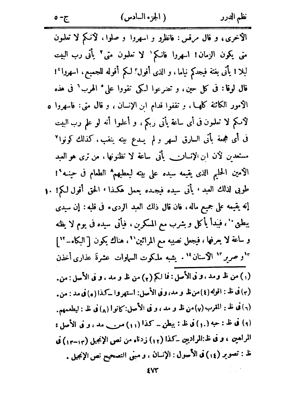 الأخرى، وقال مرقس: فانظروا واسهروا وصلّوا، لأنكم لا تعلمون متى يكون الزمان! اسهروا فإنكم لا تعملون متى يأتي رب البيت ليلاً! يأتي بغتة فيجدكم نياماً، والذي أقول لكم أقوله للجميع، اسهروا! قال لوقا: في كل حين وتضرعوا لكي تقووا على الهرب في هذه الأمور الكائنة كلها، وتقفوا قدام ابن الإنسان، وقال متى: فاسهروا لأنكم لا تعلمون في أية ساعة يأتي ربكم، واعلموا أنه لو علم رب البيت في أي هجعة يأتي السارق لسهر ولم يدع بيته ينقب، كذلك كونوا مستعدين لأن ابن الإنسان يأتي ساعة لا تظنونها، من ترى هو العبد الأمين الحليم الذي يقيمه سيده على بيته ليعطيهم الطعام في حينه! طوبى لذلك العبد، يأتي سيده فيجده يعمل هكذا، الحق أقول لكم! إنه يقيمه على جميع ماله، فإن قال ذلك العبد الرديء في قلبه: إن سيدي يبطىء، فيبدأ يأكل ويشرب مع المسكرين فيأتي سيده في يوم لا يظنه وساعة لا يعرفها، فيجعل نصيبه مع المرائين، هناك يكون البكاء وصرير الأسنان.