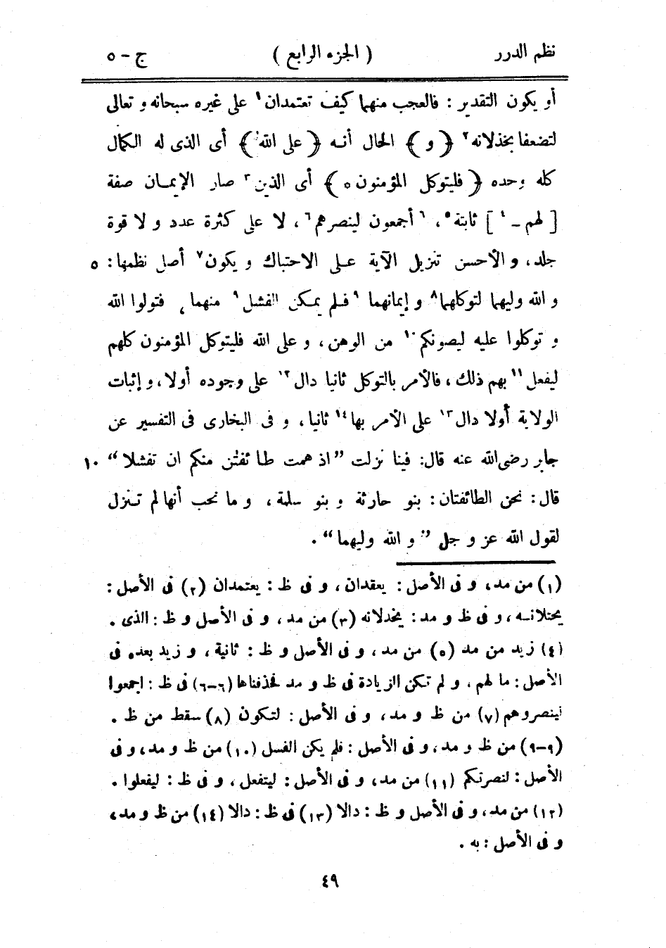 أو يكون التقدير: فالعجب منهما كيف تعتمدان على غيره سبحانه وتعالى لتضعفا بخذلانه {و} الحال أنه {على الله} أي الذي له الكمال كله وحده {فليتوكل المؤمنون *} أي الذين صار الإيمان صفة لهم ثابتة، أجمعون لينصرهم، لا على كثرة عدد ولا قوة جلد، والأحسن تنزيل الآية على الاحتباك ويكون أصل نظمها: والله وليهما لتوكلهما وإيمانهما فلم يمكن الفشل منهما، فتولوا الله وتوكلوا عليه ليصونكم من الوهن، وعلى الله فليتوكل المؤمنون كلهم ليفعل بهم ذلك، فالأمر بالتوكل ثانياً دال على وجوده أولاً، وإثبات الولاية أولاً دال على الأمر بها ثانياً، وفي البخاري في التفسير عن جابر رضي الله عنه قال: فينا نزلت {إذ همت طائفتين منكم أن تفشلا} قال: نحن الطائفتان: بنو حارثة وبنو سلمة، وما نحب أنها لم تنزل لقول الله عز وجل: {والله وليهما} .