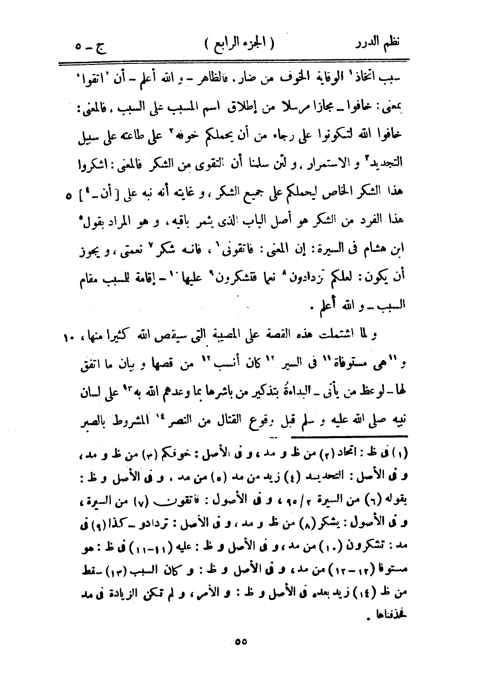 سبب اتخاذ الوقاية الخوف من ضاره فالظاهر - والله أعلم - أن اتقوا بمعنى: خافوا - مجازاً مرسلاً من إطلاق اسم المسبب على السبب، فالمعنى: خافوا الله لتكونوا على رجاء من أن يحملكم خوفه على طاعته على سبيل التجديد والاستمرار، ولئن سلمنا أن التقوى من الشكر فالمعنى: اشكروا هذا الشكر الخاص ليحملكم على جميع الشكر، وغايته أنه نبه على أن هذا الفرد من الشكر هو أصل الباب الذي يثمر باقيه، وهوالمراد بقول ابن هشام في السيرة: إن المعنى: فاتقوني، فإنه شكر نعمتي، ويجوز أن يكون: لعلكم تزدادون نعماً فتشكرون عليها - إقامة للمسبب مقام السبب - والله أعلم.