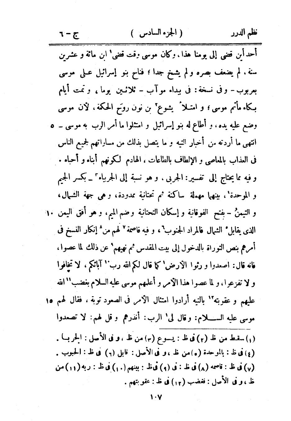 أحد أين قضى إلى يومنا هذا، وكان موسى وقت قضى ابن مائة وعشرين سنة، لم يضعف بصره ولم يشخ جداً؛ فناح بنو إسرائيل على موسى بعربوب - وفي نسخه: في بيداء موآب - ثلاثين يوماً، وتمت أيام بكاء مأتم موسى؛ وامتلأ يشوع بن نون روَح الحكمة، لأن موسى وضع عليه يده، وأطاع له بنو إسرائيل وامتثلوا ما أمر الرب به موسى - انتهى ما أردته من أخبار التيه وما يتصل بذلك من مساواتهم لجميع الناس في العذاب بالمعاصي والإلطاف بالطاعات، الهادم لكونهم أبناء وأحباء.