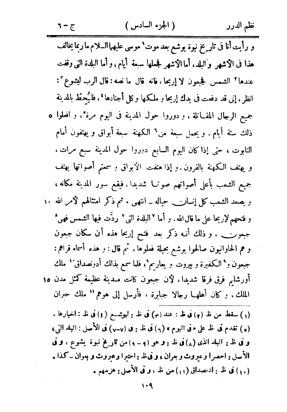 ثم ذكر امتثالهم لأمر الله وفتحهم لإريحا على ما قال الله، وأما البلدة التي ردَّت فيها الشمس فهي جبعون، وذلك أنه ذكر بعد فتح إريحا هذه أن سكون جعبون وهم الحاوانيون صالحوا يوشع بحيلة فعلوها، ثم قال: وهذه أسماء قراهم: جبعون والكفيرة وبيروت ويعاريم، فلما سمع بذلك أدونصداق ملك أورشليم فرق فرقاً شديداً، لأن جبعون كانت مدينة عظيمة كمثل مدن الملك، وكان أهلها رجالاً جبابرة، فأرسل إلى هوهم ملك حبران -