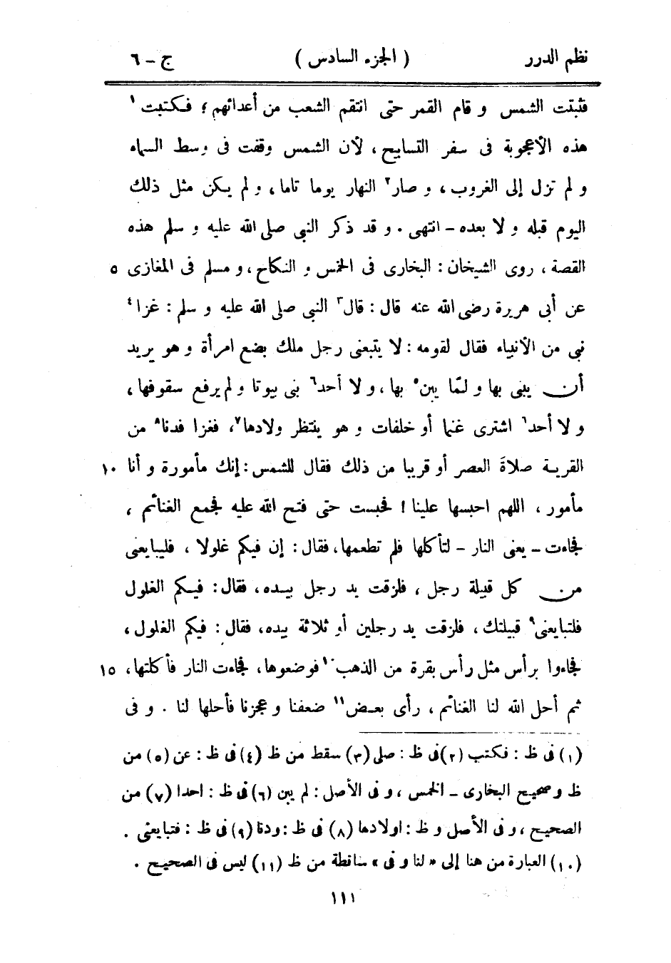 فثبتت الشمس وقام القمر حتى انتقم الشعب من أعدائهم؛ فكتبت هذه الأعجوبة في سفر التسابيح، لأن الشمس وقفت في وسط السماء ولم تزل إلى الغروب، وصار النهار يوماً تاماً، ولم يكن مثل ذلك اليوم قبله ولا بعده - انتهى. وقد ذكر النبي صَلَّى اللهُ عَلَيْهِ وَسَلَّمَ هذه القصة، روى الشيخان: البخاري في الخمس والنكاح، ومسلم في المغازي عن أبي هريرة رضي الله عنه قالك «قال النبي صَلَّى اللهُ عَلَيْهِ وَسَلَّمَ:» غزا نبي من الأنبياء فقال لقومه: لا يتبعني رجل ملك بضع امرأة وهو يريد أن يبني بها ولمّا يبن بها، ولا أحد بنى بيوتاً ولم يرفع سقوفها، ولا أحد اشترى غنماً أو خلفات وهو ينتظر ولادها، فغزا فدنا من القرية صلاةَ العصر أو قريباً من ذلك فقال للشمس: إنك مأمورة وأنا مأمور، اللهم احبسها علينا! فحبست حتى فتح الله عليه فجمع الغنائم، فجاءت - يعني النار - لتأكلها فلم تطعمها، فقال: إن فيكم غلولاً، فليبايعني من كل قبيلة رجل، فلزقت يد رجل بيده، فقال: فيكم الغلول فلتبايعني قبيلتك، فلزقت يد رجلين أو ثلاثة بيده، فقال: فيكم الغلول، فجاؤوا برأس مثل رأس بقرة من الذهب فوضعوها، فجاءت النار فأكلتها ثم أحل الله لنا الغنائم، رأى بعض ضعفنا وعجزنا فأحلها لنا «