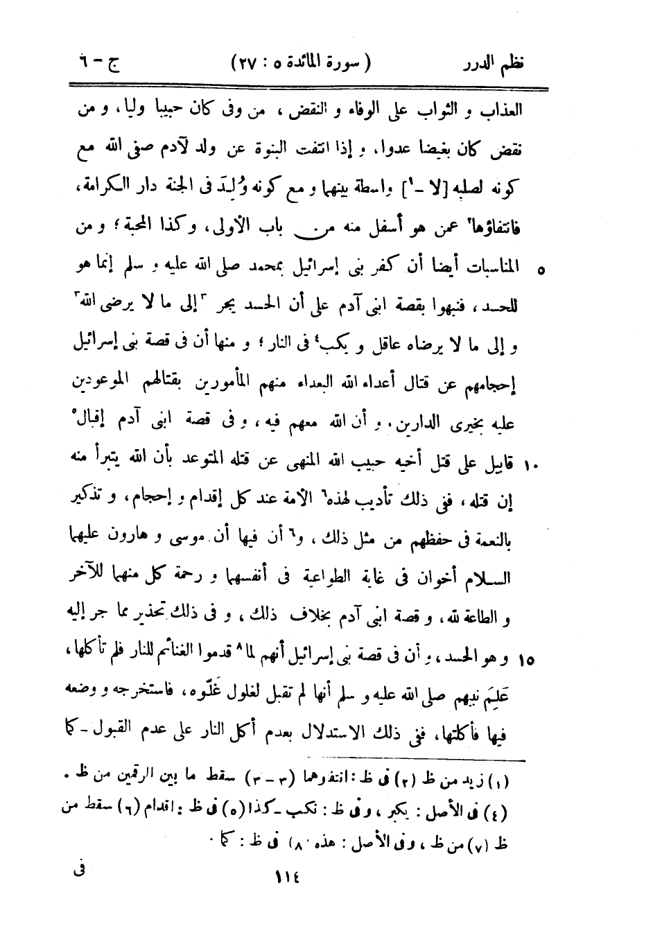 العذاب والثواب على الوفاء والنقض، من وفى كان حبيباً ولياً، ومن نقض كان بغيضاً عدواً، وإذا انتفت البنوة عن ولد لآدم صفي الله مع كونه لصلبه لا واسطة بينهما ومع كونه وُلِدَ في الجنة دار الكرامة، فانتفاؤها عمن هو أسفل منه من باب الأولى، وكذا المحبة؛ ومن المناسبات أيضاً أن كفر بني إسرائيل بمحمد صَلَّى اللهُ عَلَيْهِ وَسَلَّمَ إنما هو للحسد، فنبهوا بقضة ابني آدم على أن الحسد يجر إلى ما لا يرضي الله وإلى ما لا يرضاه عاقل ويكب في النار؛ ومنها أن في قصة بني إسرائيل إحجامهم عن قتال أعداء الله البعداء منهم المأمورين بقتالهم الموعودين عليه بخيري الدارين، وأن الله معهم فيه، وفي قصة ابني آدم إقبال قابيل على قتل أخيه حبيب الله المنهي عن قتله المتوعد بأن الله يتبرأ منه إن قتله، ففي ذلك تأديب لهذه الأمة عند كل إقدام وإحجام، وتذكير بالنعمة في حفظهم من مثل ذلك، وأن فيها أن موسى وهارون عليهما السلام أخوان في غاية الطواعية في أنفسهما، ورحمة كل منهما للآخر والطاعة لله، وقصة ابني آدم بخلاف ذلك، وفي ذلك تحذير مما جر إليه وهو الحسد، وأن في قصة بني إسرائيل أنهم لما قدموا الغنائم للنار فلم تأكلها، عَلِمَ نبيهم صَلَّى اللهُ عَلَيْهِ وَسَلَّمَ أنها لم تقبل لغلول غَلّوه، فاستخرجه ووضعه فيها فأكلتها، ففي ذلك الاستدلال بعدم أكل النار على عدم القبول - كما
