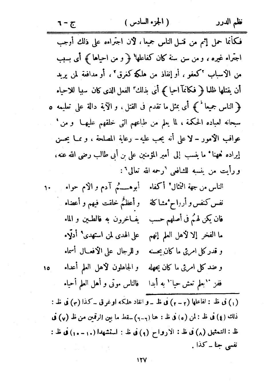 فكأنما حمل إثم من قتل الناس جميعاً، لأن اجتراءه على ذلك أوجب اجتراء غيره، ومن سن سنة كان كفاعلها {ومن أحياها} أي بسبب من الأسباب كعفو، أو إنقاذ من هلكة كغرق، أو مدافعة لمن يريد أن يقتلها ظلماً {فكأنما أحيا} أي بذلك الفعل الذي كان سبباً للأحياء {الناس جميعاً} أي بمثل ما تقدم في القتل، والآية دالة على تعليمه سبحانه لعباده الحكمة، لما يعلم من طباعهم التي خلقهم عليها ومن عواقب الأمور - لا على أنه يجب عليه - رعاية المصلحة، ومما يحسن إيراده هاهنا ما ينسب إلى أمير المؤمنين علي بن أبي طالب رضي الله عنه، ورأيت من ينسبه للشافعي رحمه الله تعالى: