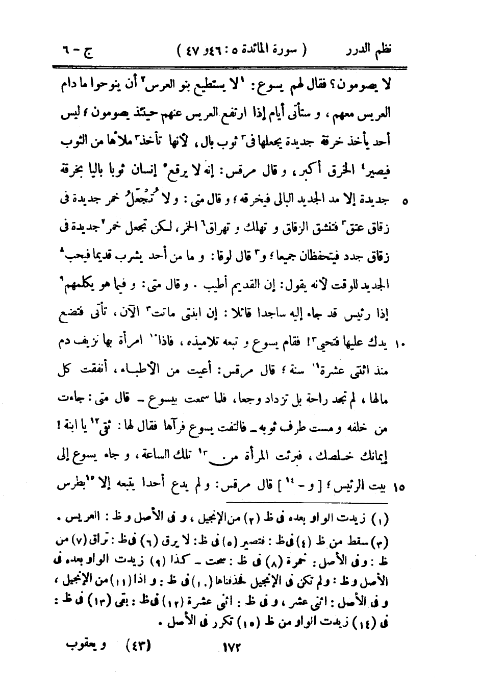 لا يصومون؟ فقال لهم يسوع: لا يستطيع بنو العرس أن ينوحوا ما دام العريس معهم، وستأتي أيام إذا ارتفع العريس عنهم حينئذ صومون؛ ليس أحد يأخذ خرقة جديدة يجعلها في ثوب بال، لأنها تأخذ ملأها من الثوب فيصير الخرق أكبر وقال مرقس: إنه لا يرقع إنسان ثوباً بالياً بخرقة جديدة إلا مد الجديد البالي فيخرقه؛ وقال متى: ولا تُجْعَلُ خمر جديدة في زقاق عتق فتنشق الزقاق وتهلك وتهراق الخمر لكن تجعل خمر جديدة في زقاق جدد فيتحفظان جميعاً؛ وقال لوقا: وما من أحد يشرب قديماً فيحب الجديد للوقت لأنه يقول: إن القديم أطيب، وقال متى: وفيما هو يكلمهم إذا رئيس قد جاء إليه ساجداً قائلاً: إن ابنتي ماتت الآن، تأتي فتضع يدك عليها فتحيى! فقام يسوع وتبعه تلاميذه، فإذا امرأة بها نزيف دم منذ اثنتي عشرة سنة؛ قال مرقس: أعيت من الأطباء، أنفقت كل مالها، لم تجد راحة بل تزداد وجعاً، فلما سمعت بيسوع - قال متى: جاءت من خلفه ومست طرفه ثوبه - فالتفت يسوع فرآها فقال لها: ثقي يا ابنة! إيمانك خلصك، فبرئت المرأة من تلك الساعة، وجاء يسوع إلى بيت الرئيس؛ وقال مرقس: ولم يدع أحداً يتبعه إلا بطرس