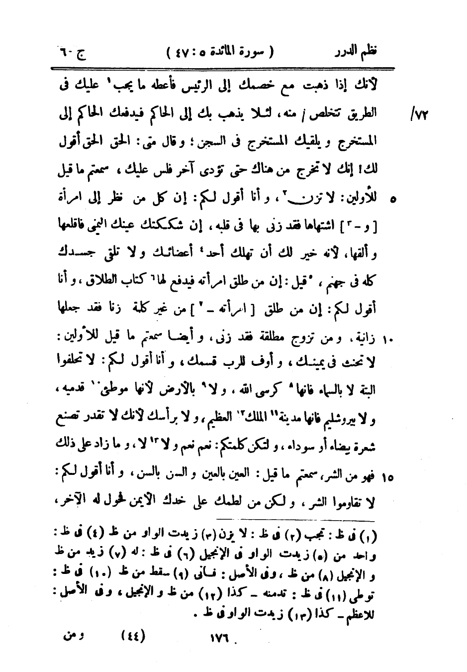 لأنك إذا ذهبت مع خصمك إلى الرئيس فأعطه ما يجب عليك في الطريق تتخلص منه، لئلا يذهب بك إلى الحاكم فيدفعك الحاكم إلى المستخرج ويلقيك المستخرج في السجن؛ وقال متى: الحق الحق أقول لك! إنك لا تخرج من هناك حتى تؤدي آخر فلس عليك، سمعتم ما قيل للأولين: لا تزن، وأنا أقول لكم: إن كل من نظر إلى امرأة واشتهاها فقد زنى بها في قلبه، إن شككتك عينك اليمنى فاقلعها وألقها، لأنه خير لك أن تهلك أحد أعضائك ولا تلقي جسدك كله في جهنم، قيل: إن من طلق امرأته فيدفع لها كتاب الطلاق، وأنا أقول لكم: إن من طلق امرأته من غير كلمة زنا فقد جعلها زانية، ومن تزوج مطلقة فقد زنى، وأيضاً سمعتم ما قيل للأولين: لا تحنث في مينك، وأوف للرب قسمك، وأنا اقول لكم: إن من طلق امرأته من غير كلمة زنا فقد جعلها زانية، ومن تزوج مطلقة فقد زنى، وأيضاً سمعتم ما قيل للأولين: لا تحنث في مينك، وأوف للرب قسمك، وأنا أقول لكم: لا تحلفوا البتة لا بالسماء فإنها كرسي الله، ولا بالأرض لأنها موطىء قدميه، ولا بيروشليم فإنها مدينة الملك العظيم، ولا برأسك لأنك لا تقدر تصنع شعرة بيضاء أو سوداء، ولتكن كلمتكم: نعم ونعم ولا لا، وما زاد على ذلك فهو من الشر، سمعتم ما قيل: العين بالعين والسن بالسن، وأنا أقول لكم: لا تقاوموا الشر، ولكن من لطمك على خدك الأيمن فحول له الآخر،