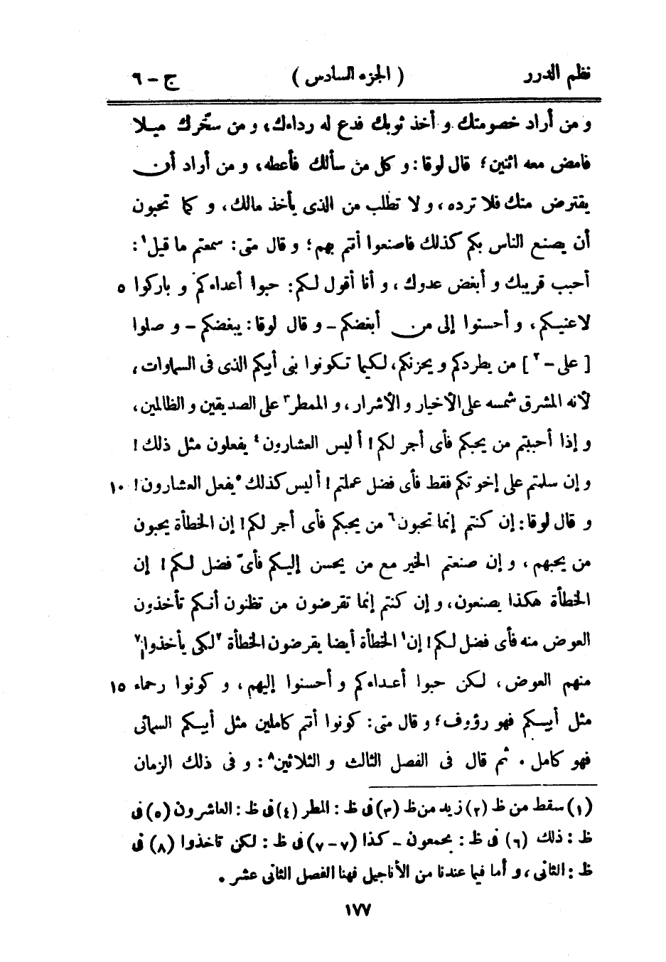 ومن أراد خصومتك وأخذ ثوبك دفع له رداءك، ومن سخّرك ميلاً فامض مع اثنين، قال لوقا: وكل من سألك فأعطه، ومن أراد أن يقترض منك فلا ترده، ولا تطلب من الذي يأخذ مالك، وكما تحبون أن يصنع الناس بكم كذلك فاصنعوا أنتم بهم؛ وقال متى: سمعتم ما قيل: أحبب قريبك وابغض عدوك، وأنا أقول لكم: حبوا أعداءكم وباركوا لاعنيكم، وأحسنوا إلى من أبغضكم - وقال لوقا: يبغضكم - وصلوا على من يطردكم ويحزنكم، لكيما تكونوا بني أبيكم الذي في السماوات، لأنه المشرق شمسه على الأخيار والأشرار، والممطر على الصديقين والظالمين، وإذا أحببتم من يحبكم فأي أجر لكم! أليس العشارون يفعلون مثل ذلك! وإن سلمتم على إخوتكم فقط فأي فضل عملتم! أليس كذلك يفعل العشارون! وقال لوقا: إن كنتم إنما تحبون من يحبكم فأي أجر لكم! إن الخطأة يحبون من يحبهم، وإن صنعتم الخير مع من يحسن إليكم فأيّ فضل لكم! إن الخطأة هكذا يصنعون، وإن كنتم إنما تقرضون من تظنون أنكم تأخذون العوض منه فأي فضل لكم! إن الخطأة أيضاً يقرضون الخطأة لكي يأخذوا منهم العوض، لكن حبوا أعداءكم وأحسنوا إليهم، وكونوا رحماء مثل أبيكم فهو رؤوف، وقال متى: كونوا أنتم كاملين مثل أبيكم السمائي فهو كامل.