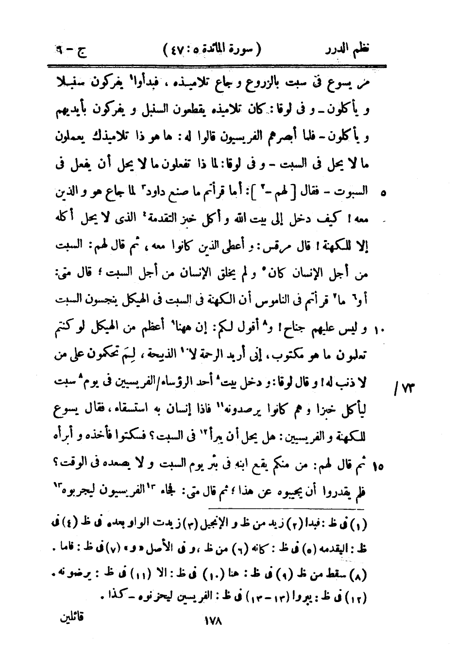 مر يسوع في سبت بالزروع وجاع تلاميذه، فبدؤوا يفركون سنبلاً ويأكلون - وفي لوقا: كان تلاميذه يقطعون السنبل ويفركون بأيديهم ويأكلون - فلما أبصرهم الفريسيون قالوا له: ها هو ذا تلاميذك يعملون ما لا يحل في السبت - وفي لوقا: لماذا تفعلون ما لا يحل أن يفعل في السبوت - فقال لهم: أما قرأتم ما صنع داود لما جاع هو والذين معه! كيف دخل إلى بيت الله وأكل خبز التقدمة الذي لا يحل أكله إلا للكهنة! قال مرقس: وأعطى الذين كانوا مع، ثم قال لهم: السبت من أجل الإنسان كان ولم يخلق الإنسان من أجل السبت؛ قال متى: أوما قرأتم في الناموس أن الكهنة في السبت في الهيكل ينجسون السبت وليس عليهم جناح! وأقول لكم: إن ها هنا أعظم من الهيكل لو كنتم تعلمون ما هو مكتوب، إني أريد الرحمة لا الذبيحة، لِمَ تحكمون على من لا ذنب له! وقال لوقا: ودخل بيت أحد الرؤساء الفريسيين في يوم سبت ليأكل خبزاً وهم كانوا يرصدونه فإذا إنسان به استسقاء، فقال يسوع للكهنة والفريسيين: هل يحل أن يبرأ في السبت؟ فسكتوا فأخذه وأبرأه ثم قال لهم: من منكم يقع ابنه في بئر يوم السبت ولا يصعده في الوقت؟ فلم يقدروا أن يجيبوه عن هذا؛ ثم قال متى: فجاء الفريسيون ليجربوه
